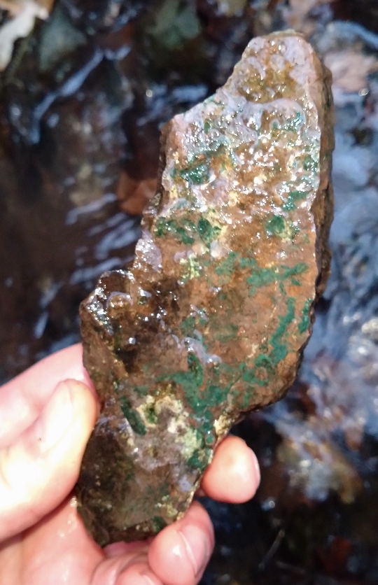 Auch sehr schön aber ebenfalls sehr instabil ist dieser reine, giftgrüne Ryolith. Ich hatte ihn kurz im Bach gereinigt aber um die ganze Fläche zu zeigen, hätte ich eine Bürste dabei haben müssen.