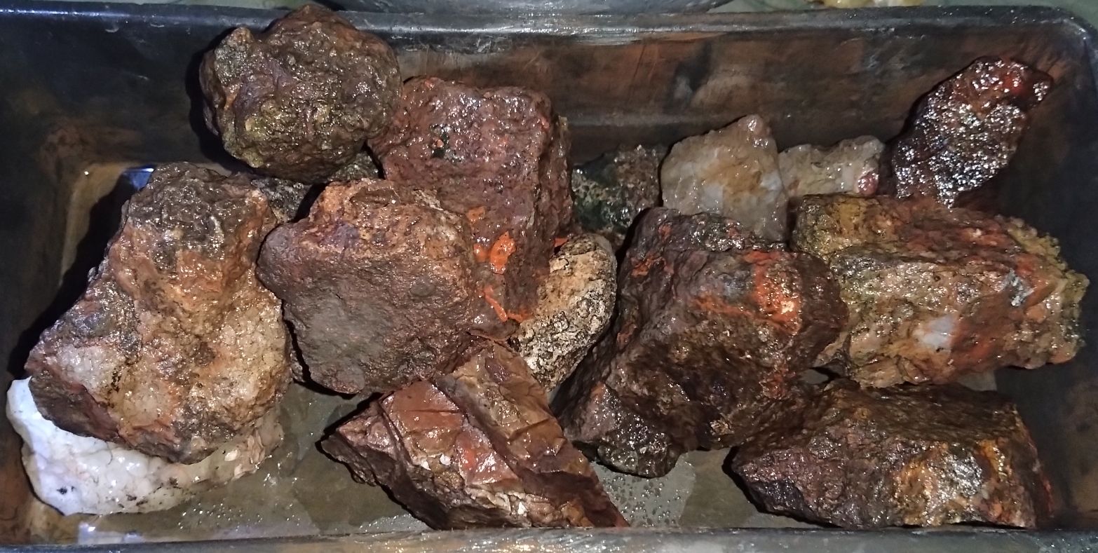 Als letztes noch die Stücke, bei denen es sich um Achat-Mandeln handeln könnte. Dabei auch Achat Bruchstücke, sowie Achat-Mandel Innenstücke (meist nur Quarze). Die extrem roten Achat Stücke (unten links und rechts) sind die gleichen, bei denen es auch in dem nachfolgenden Bericht geht, wo ich bedaure, dass ich kein Brecheisen dabei hatte.