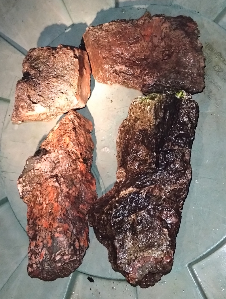 Da wir wieder im Dunkeln nach Hause gekommen sind, habe ich die Fundstücke lediglich grob abgesprüht und grob sortiert. Hier die Stücke, die eventuell etwas seien könnten, die jedoch erstmal aufgeschnitten werden müssten.