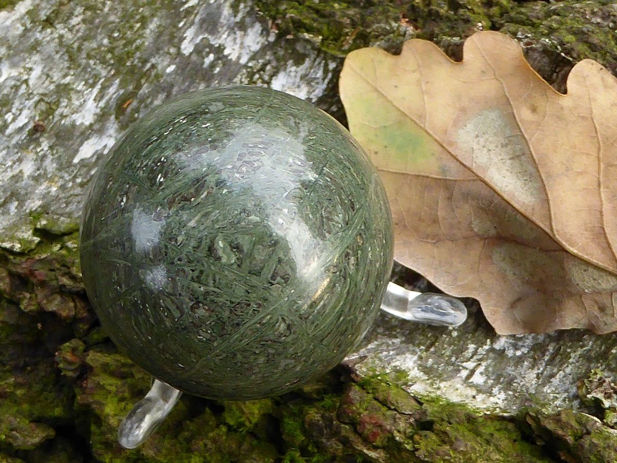 Kuriose Kugel, sieht aus wie Moosachat in geordneten faserigen Strukturen