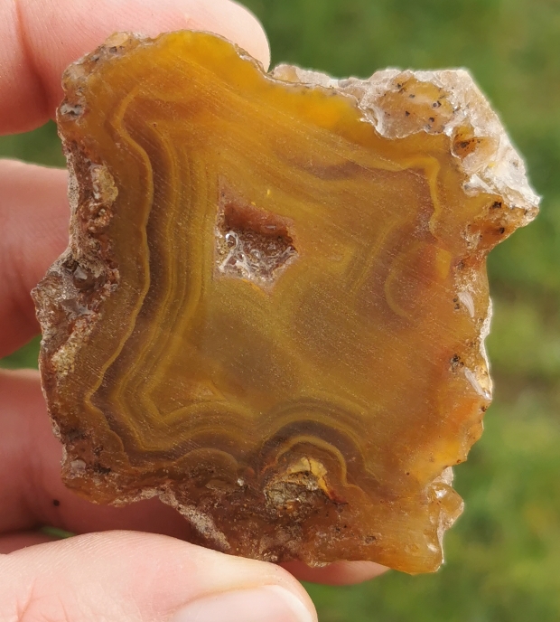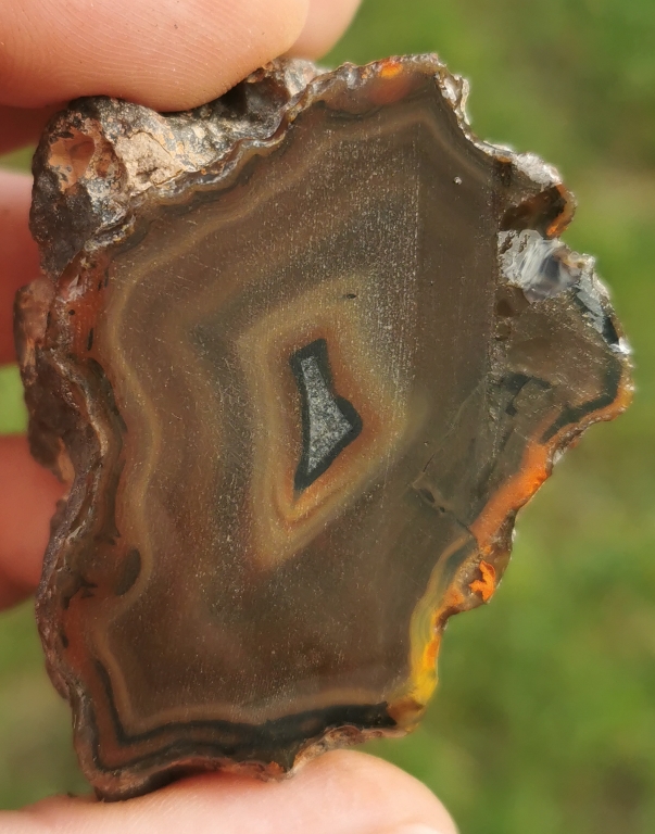 Nach dem anfänglichen Erfolg auf der Wiese bin ich zuerst an die Stelle gegangen, wo ich die Achatmandel und den Gangachat beim meinem letzten Besuch zurück lassen musste. Erfreulicherweise war das umliegende Gestein sehr weich, so dass ich schnell die Mandel bergen konnte.