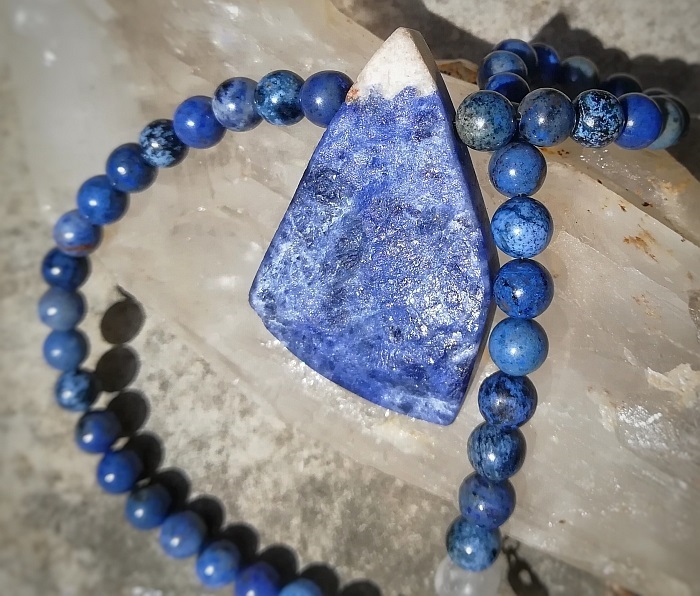 So wie bei der Kette die ich heute trage - siehe Bild. Anhänger ist ein Sodalith, die Perlen sind Dumortierit und hinten im Nacken ist jeweils auch ein kleiner Bergkristall Nugget eingearbeitet. Außerdem hab ich die Bojis bei mir.