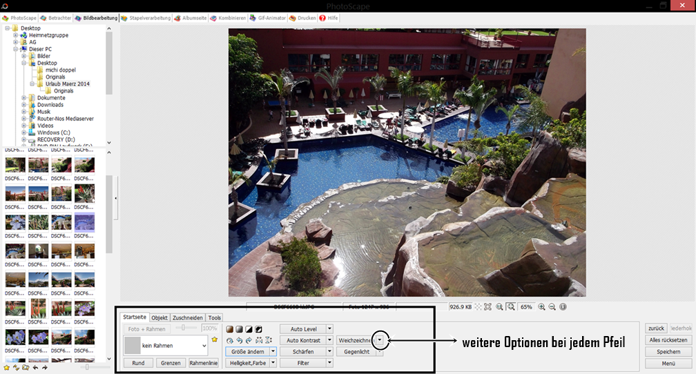 So sieht nun die Bildbearbeitung aus, überall wo ein Pfeil ist, sind weitere Optionen:
