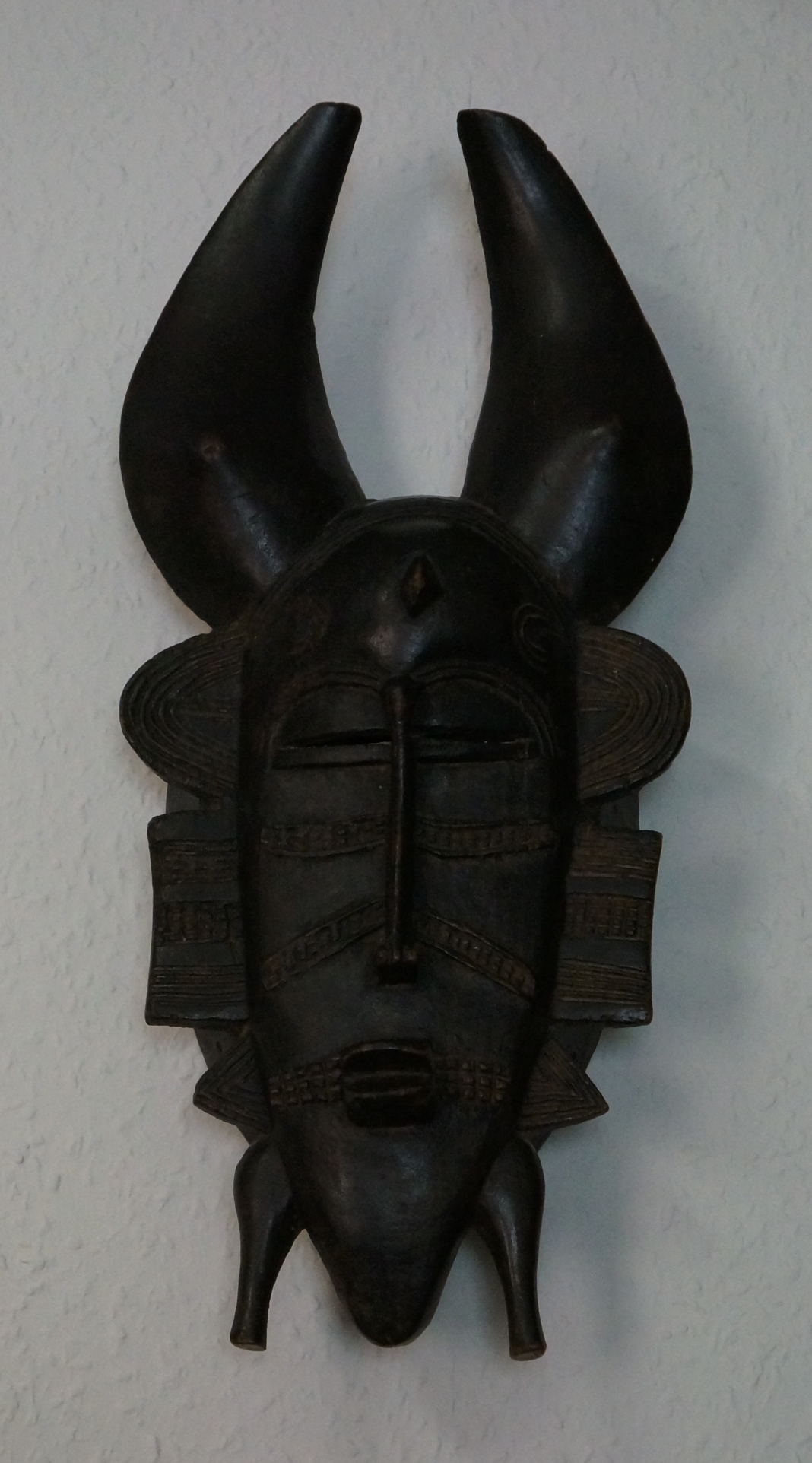 Hier wäre zunächst mal eine afrikanische Maske. Die nennt sich "Senufo Kpelie". Die Senufo sind ein Volk in Mali / Burkina Faso / Elfenbeinküste und sind bekannt für ihre kunstvollen Masken. Kpelie-Masken wurden/werden bei Initiationsriten, Begräbnissen und Erntedankfeiern verwendet.