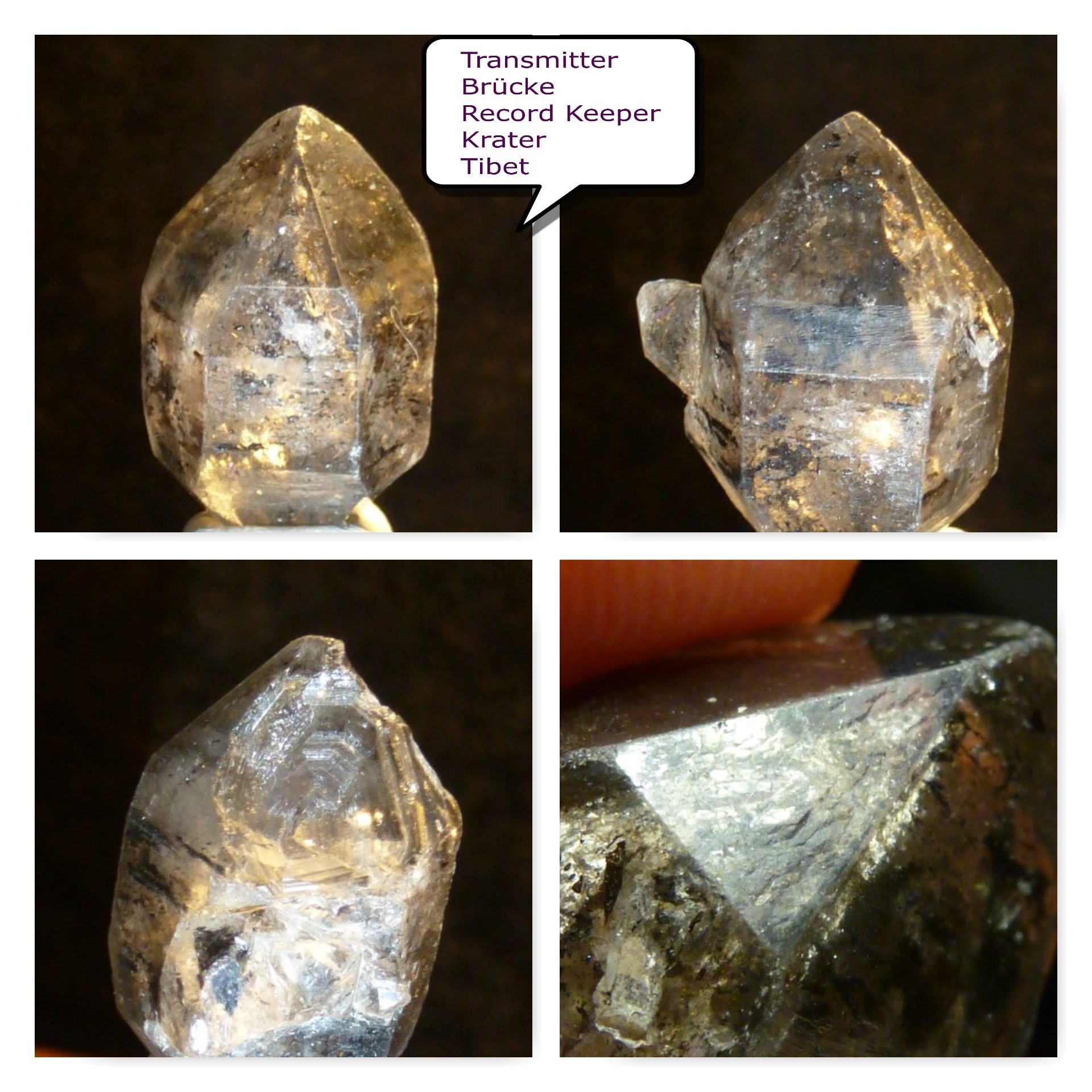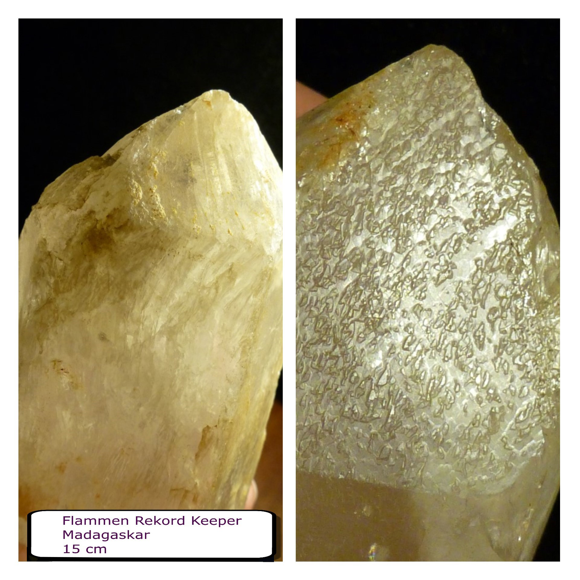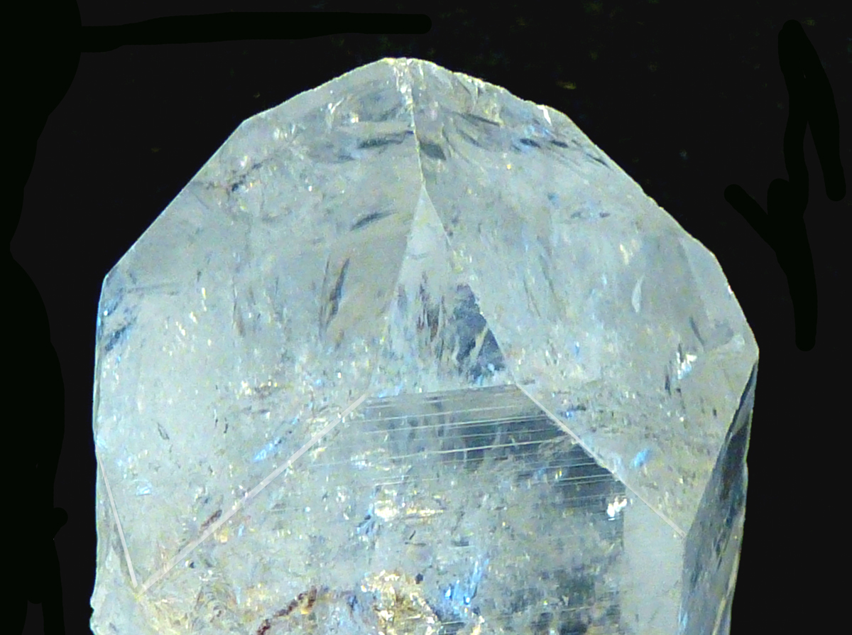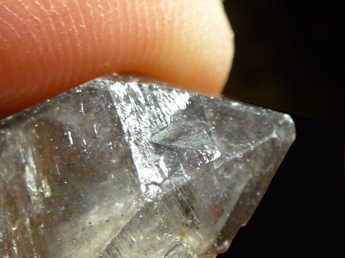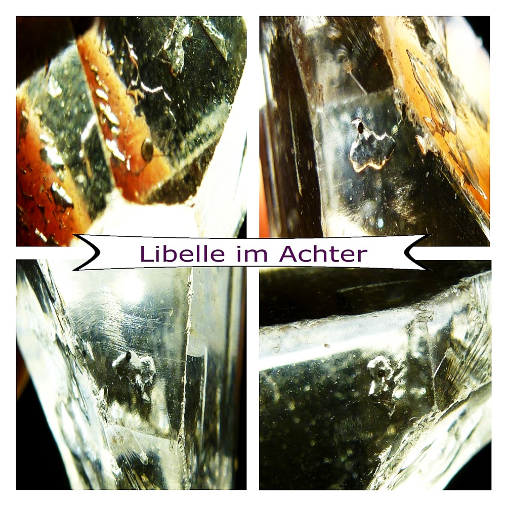 Man sieht unter einer der glatten mattglänzenden Prismen flammenartige Strukturen die nach oben steigen. Das sind mit Flüssigkeit und Gas gefüllte Fahnen. Sie manifestieren sich als kleine Vizinalflächen auf der Oberfläche der Rhomboederfläche, in die sie sichtbar hinüberziehen, etwas von der mehrdimensionalen Unordnung, oder von etwas was nicht geordnet war aus dem Inneren des Kristalls, sozusagen dort speichernd.