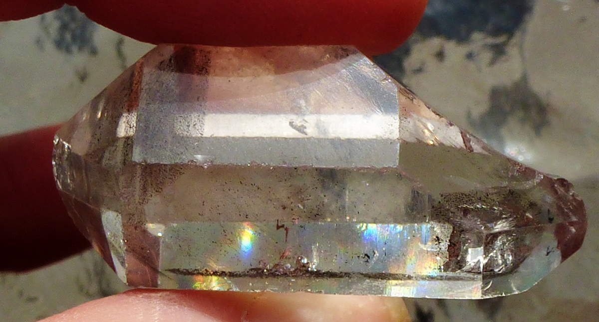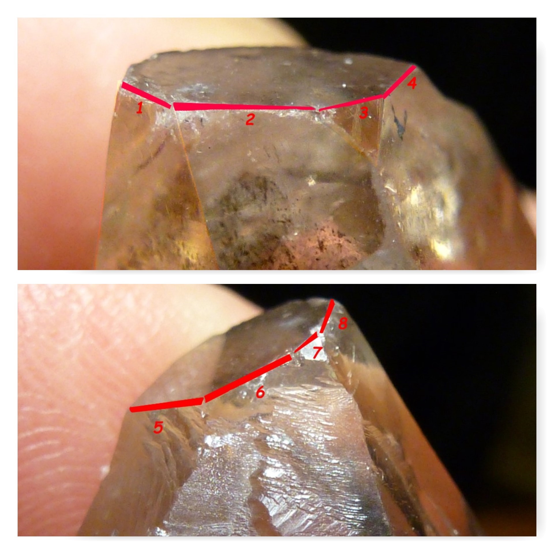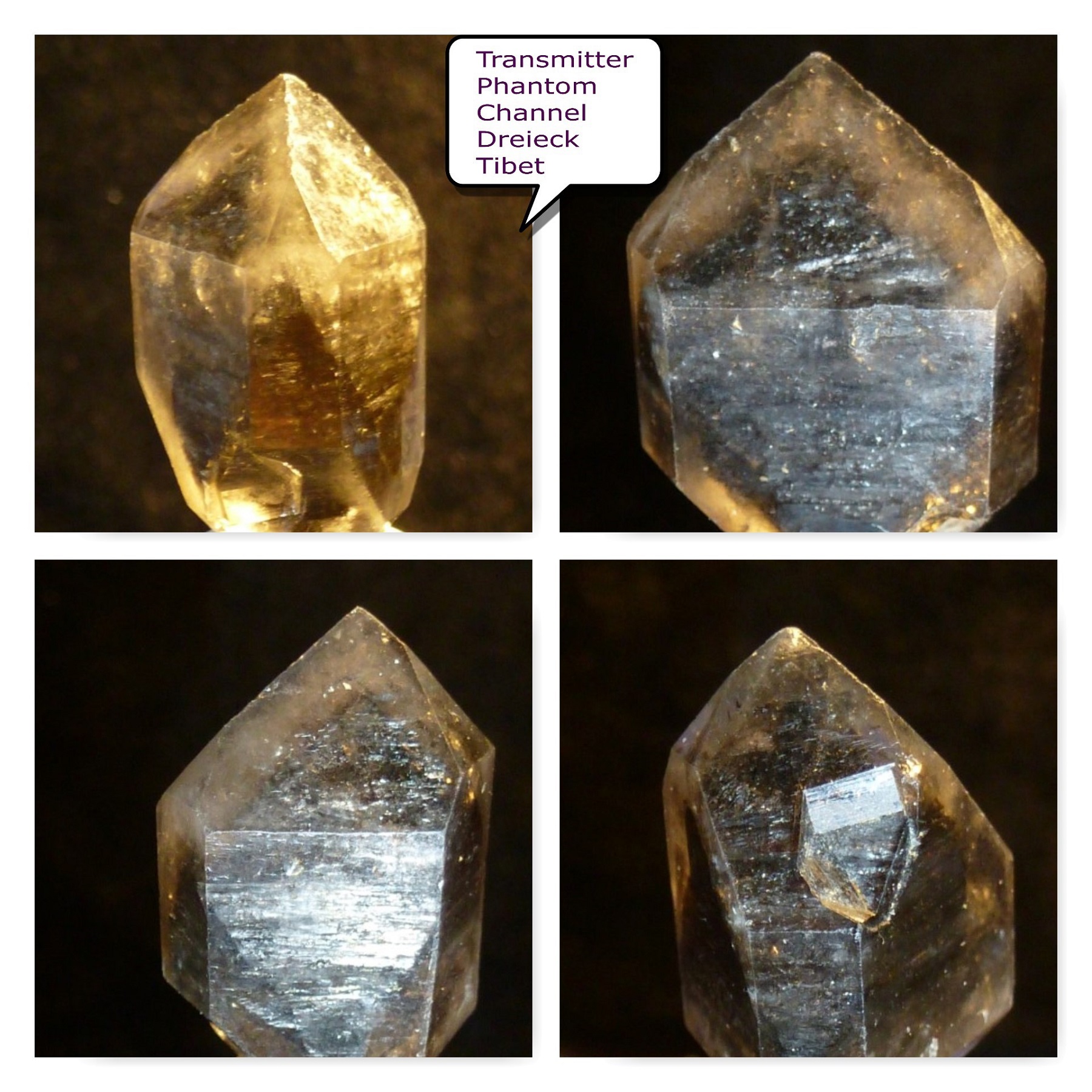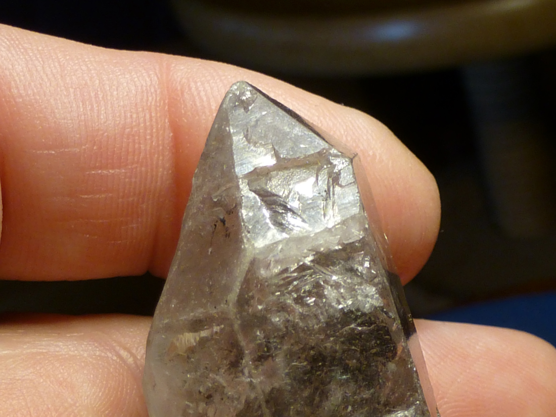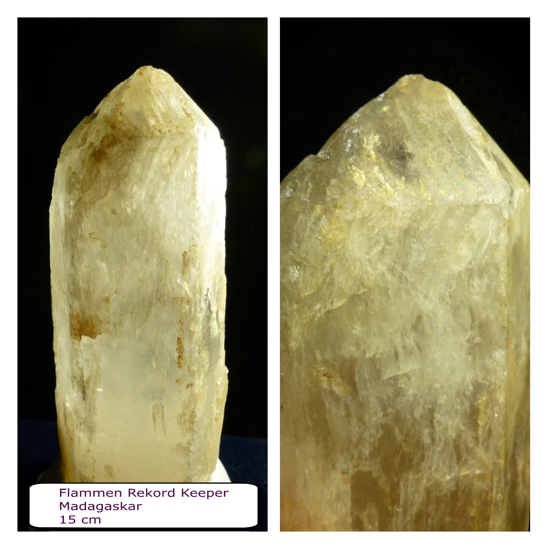 Man sieht unter einer der glatten mattglänzenden Prismen flammenartige Strukturen die nach oben steigen. Das sind mit Flüssigkeit und Gas gefüllte Fahnen. Sie manifestieren sich als kleine Vizinalflächen auf der Oberfläche der Rhomboederfläche, in die sie sichtbar hinüberziehen, etwas von der mehrdimensionalen Unordnung, oder von etwas was nicht geordnet war aus dem Inneren des Kristalls, sozusagen dort speichernd.
