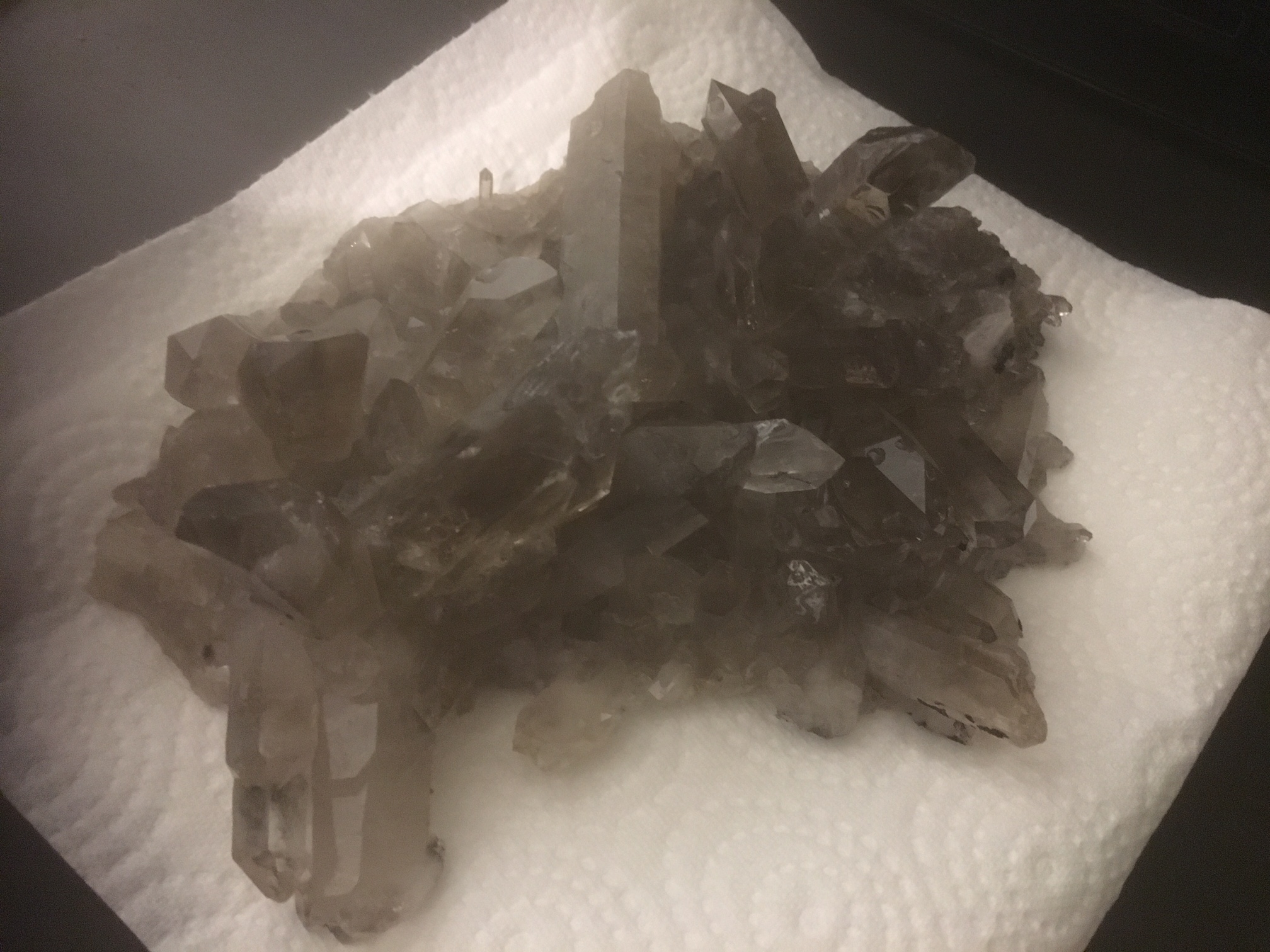 Im helleren Licht wurde ich plötzlich unsicher da der Rauchquarz ein wenig anders aussah (Einschlüsse und eine kleine Bruchstelle bei einem Kristall).