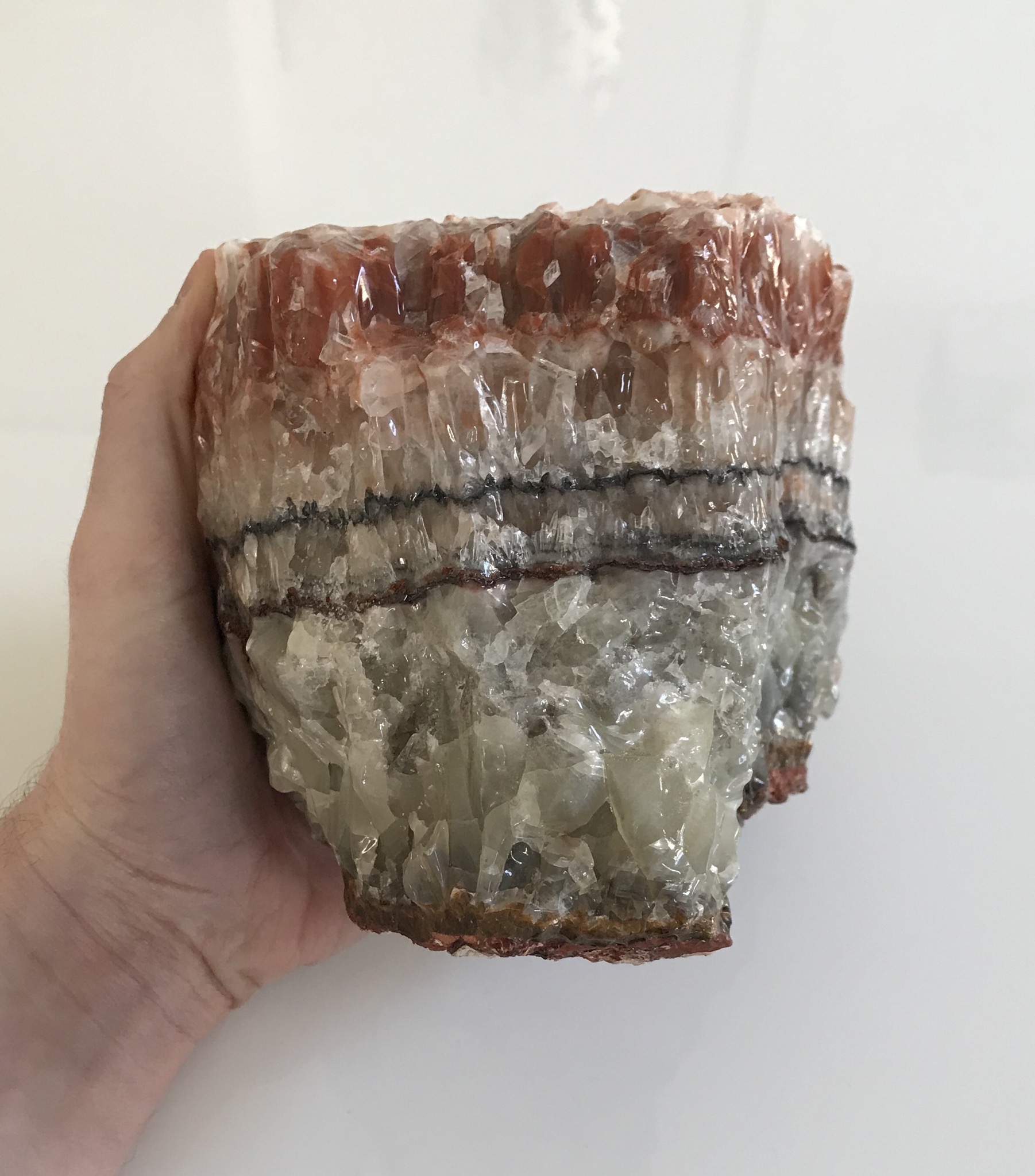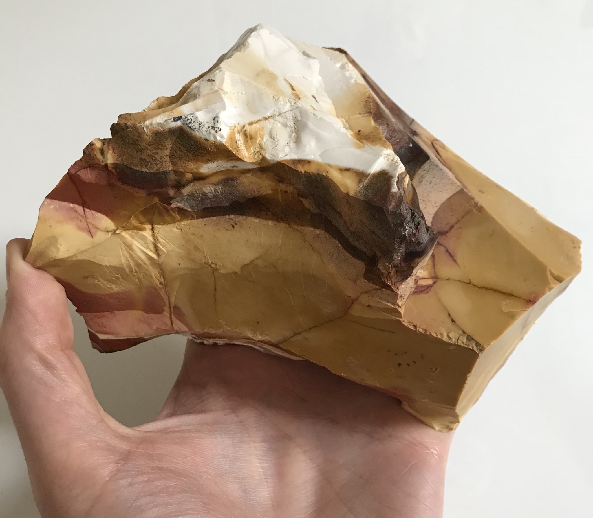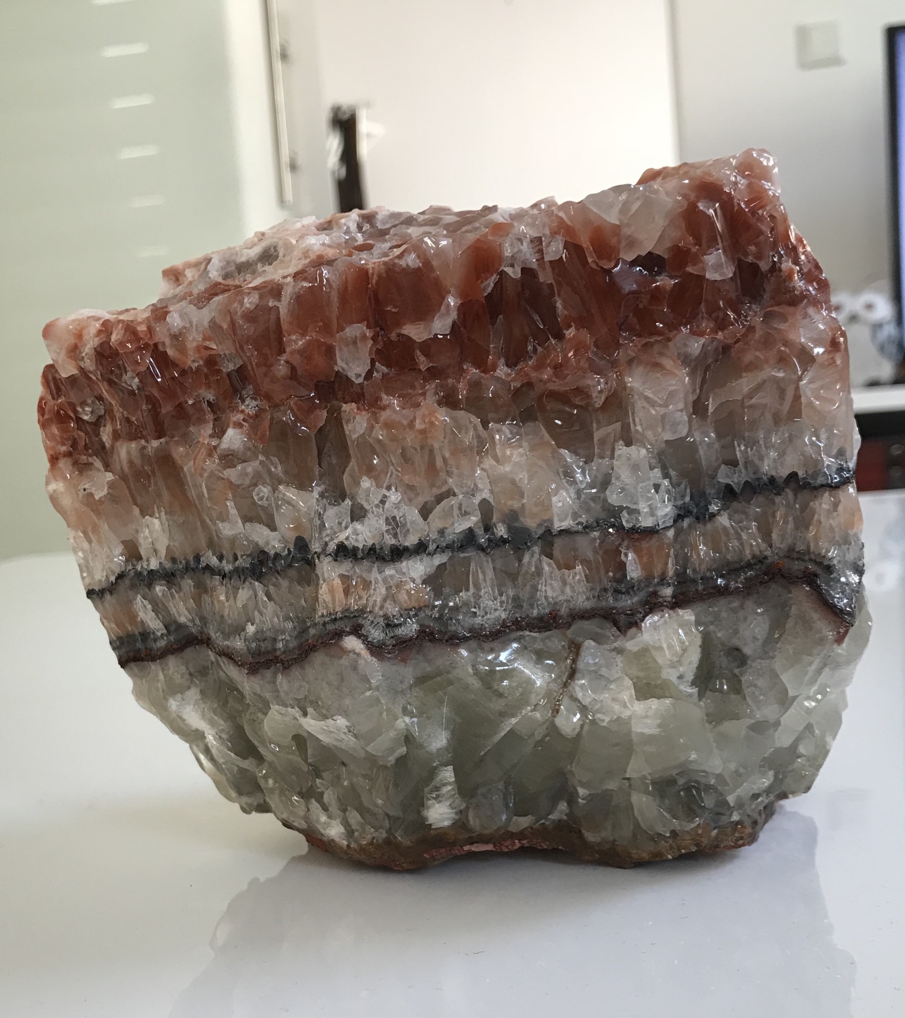 Heute stelle ich euch meinen neuen dreifarbigen Calcit aus Amerika vor. Er wiegt satte drei Kilo und hat eine, wie ich finde, schöne Form und Farbe. Gibt es für diesen Stein einen eigenen Namen?