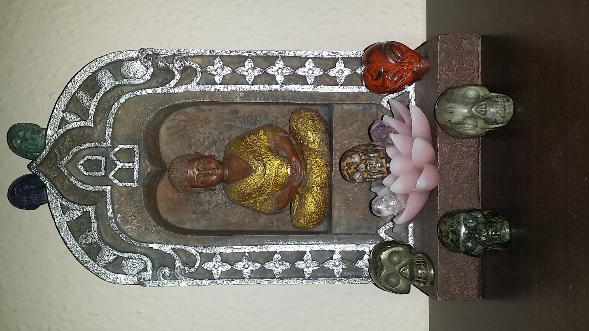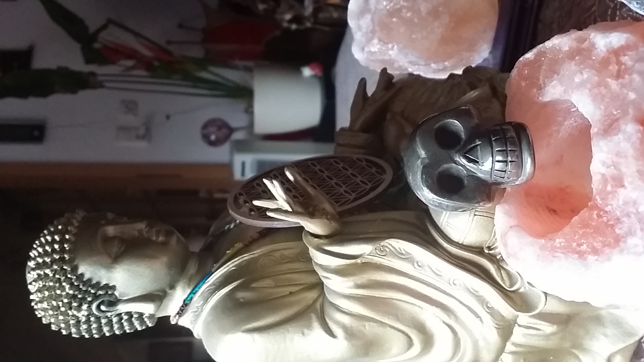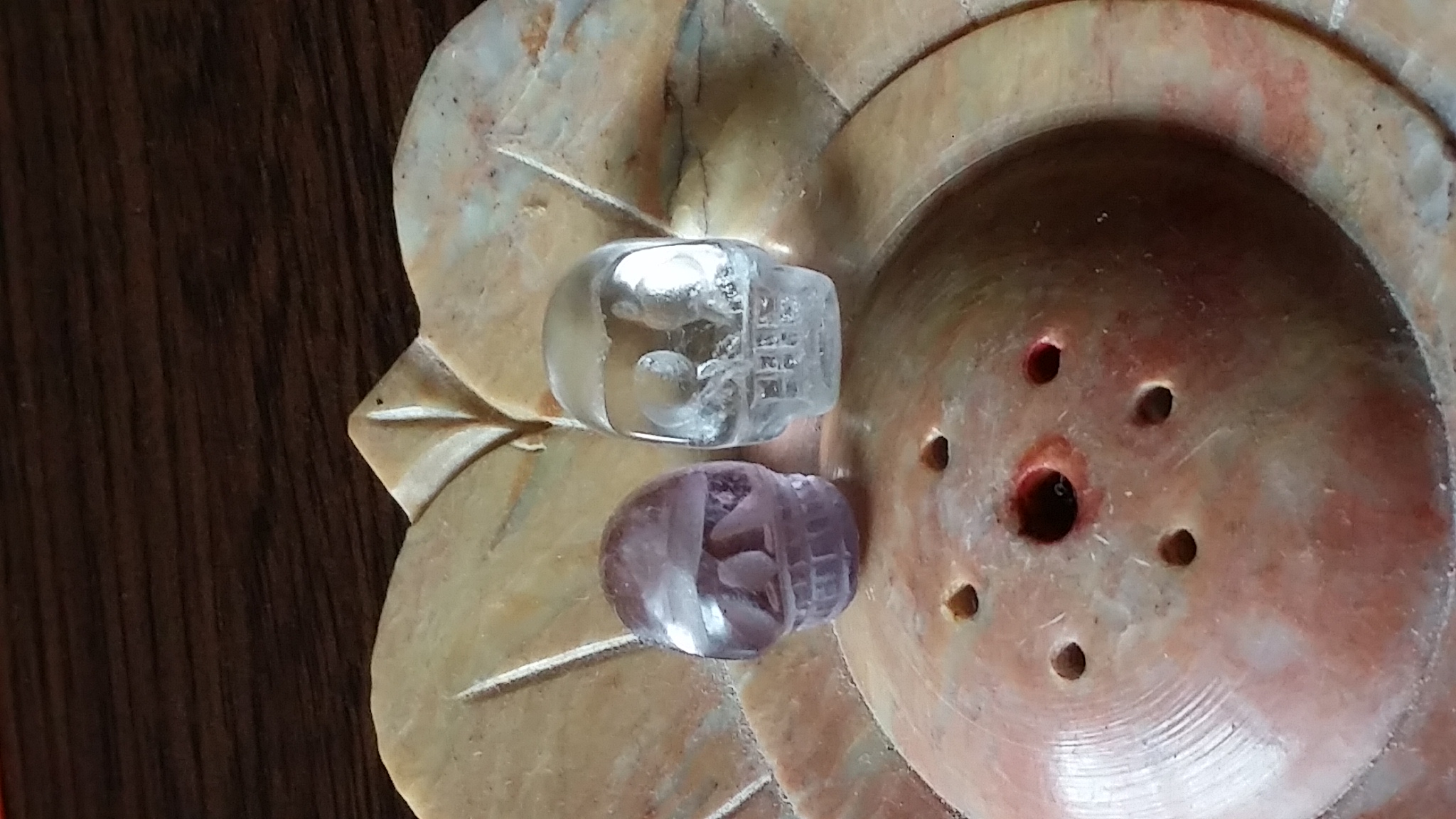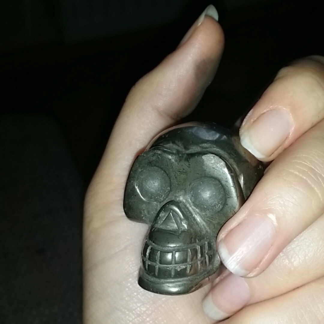 Aber ich hab dann die Macke vorsichtig mit der Nagelfeile geglättet und sah aus wie, als wenn ich mit einem Bleistift gespielt hätte? Oder färbt Pyrit ab? Dann sind Milkyway (Lapis mit Pyrit, wobei die Pyrit-sprenkel mittig über den Schädel entlang gehen), Trude (Kabamba) und die 2 Zwerge Spacy (Amethyst) & Clear Vader (Bergkristall). Jetzt muss ich mir nur einen anderen Platz suchen