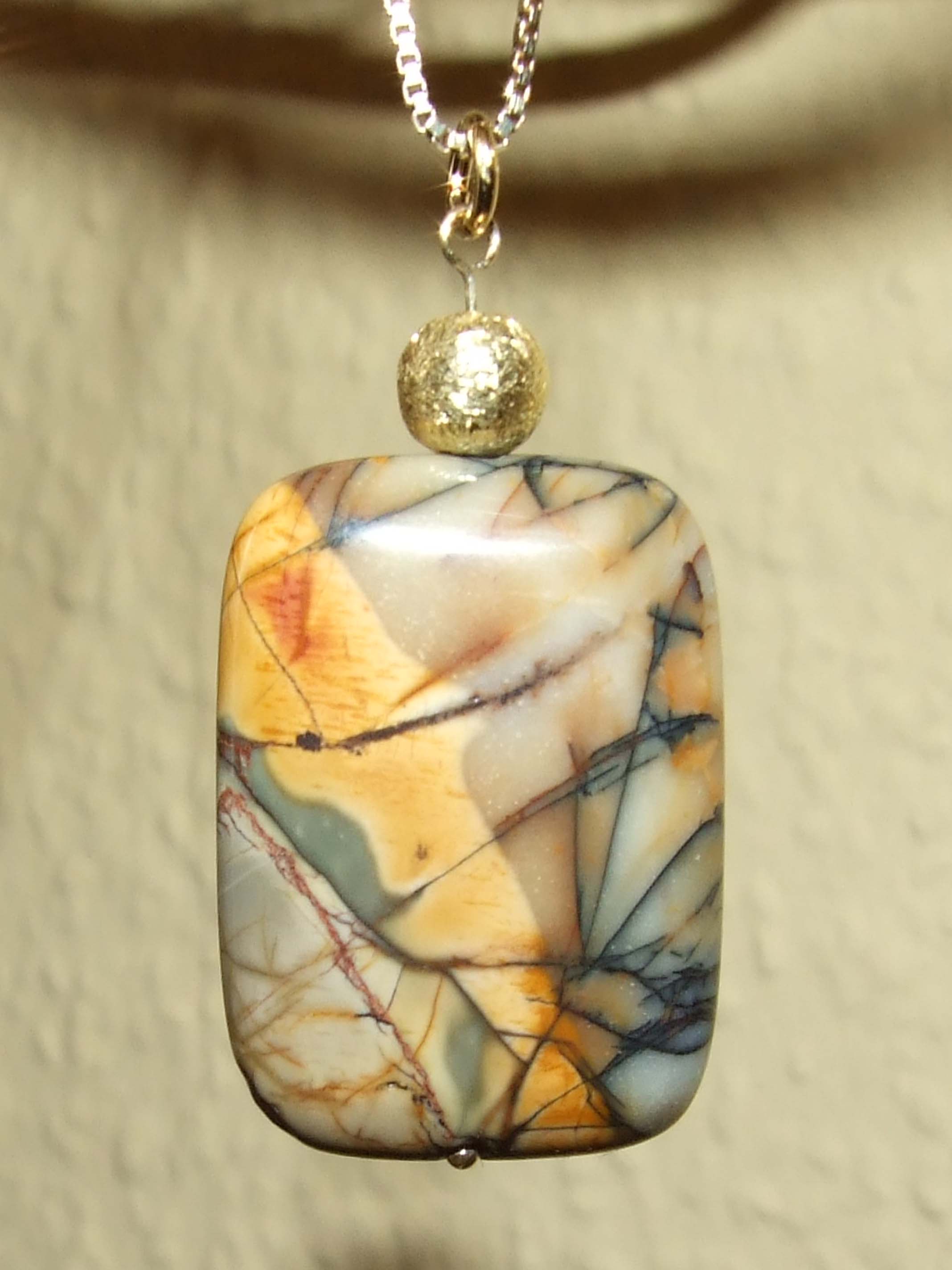 Bei mir war es gestern wieder einer meiner Polychromjaspis-Anhänger am kurzen rostfarbenem Lederband.