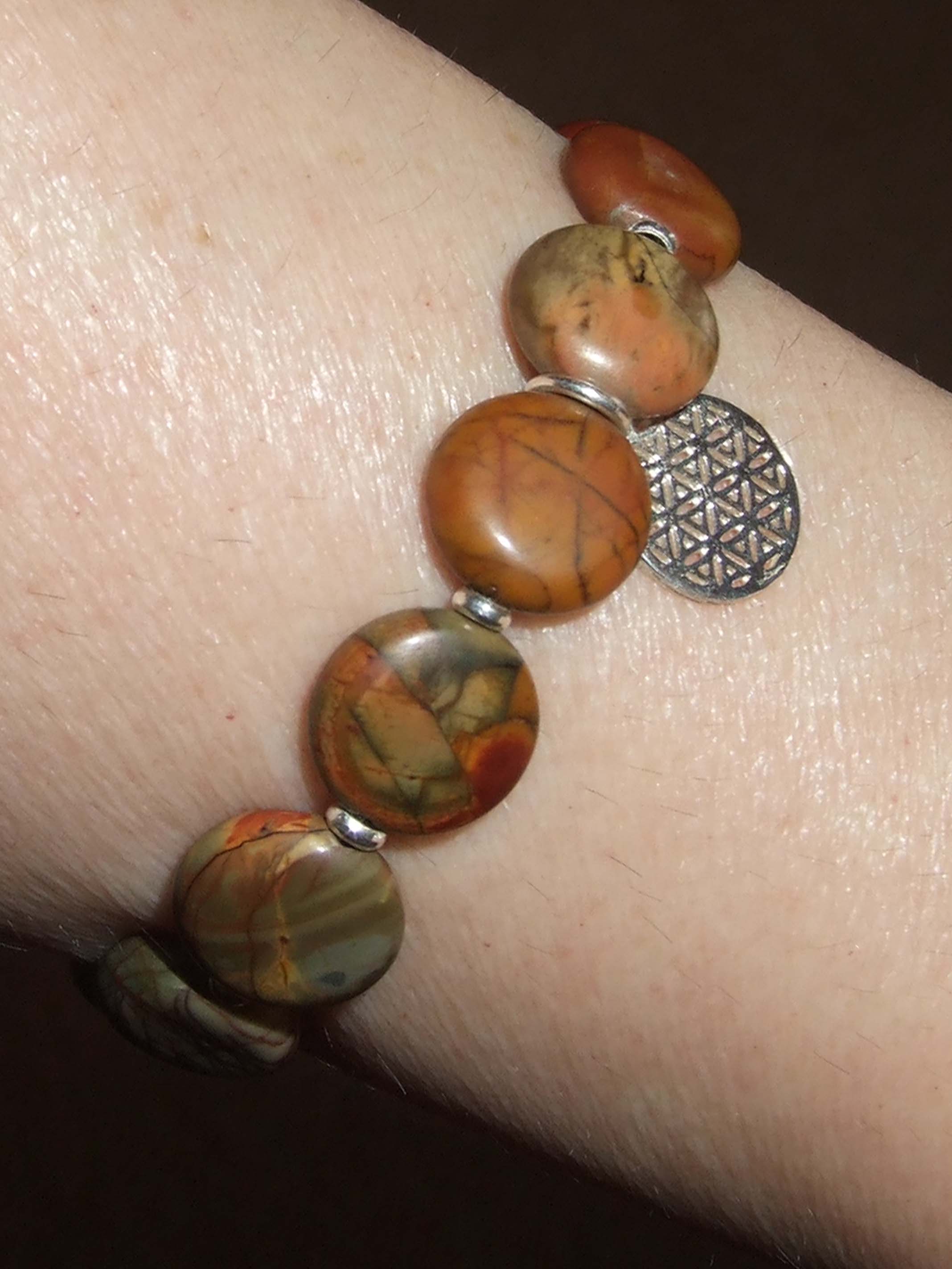 Gestern und heute meine kleinen Polychronic-Jaspis-Discs in Form von zwei Armbändern, ein auf Gummi gefädeltes und ein neues, auf Kettelstifte bzw. Silberdraht geketteltes.