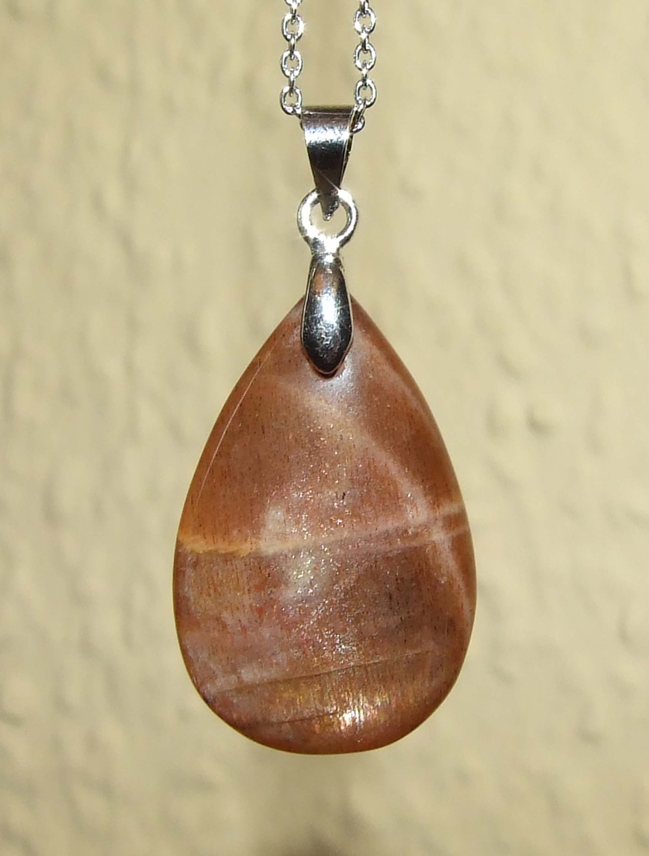 Jetzt ist es mein kleiner Sonnenstein-Tropfen, der schon etwas mondsteiniges hat, wie ich finde. Er ist Cabochon-geschliffen und hat wirklich einen schönen Schimmer und glitzert auch schön. Den habe ich nun zum ersten mal um, an einer kurzen Silberkette.