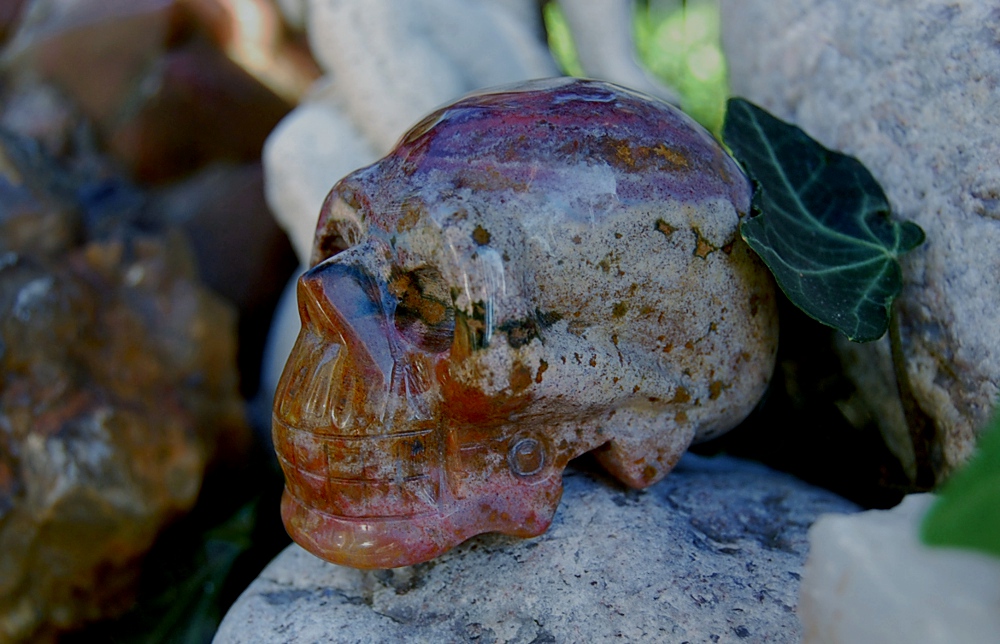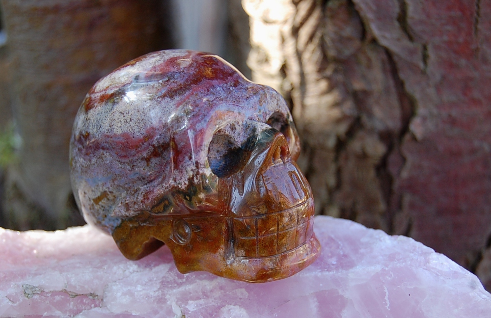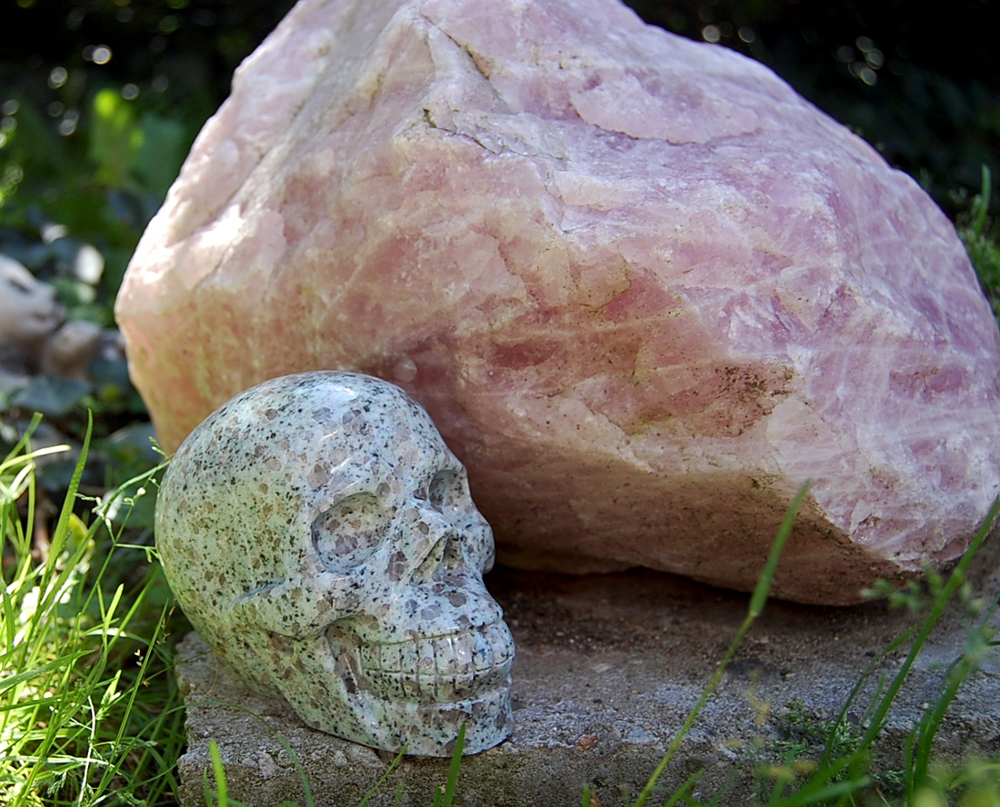 Ist der Schädel so klein oder der Rosenquarzbrocken im HIntergrund so riesengroß ?