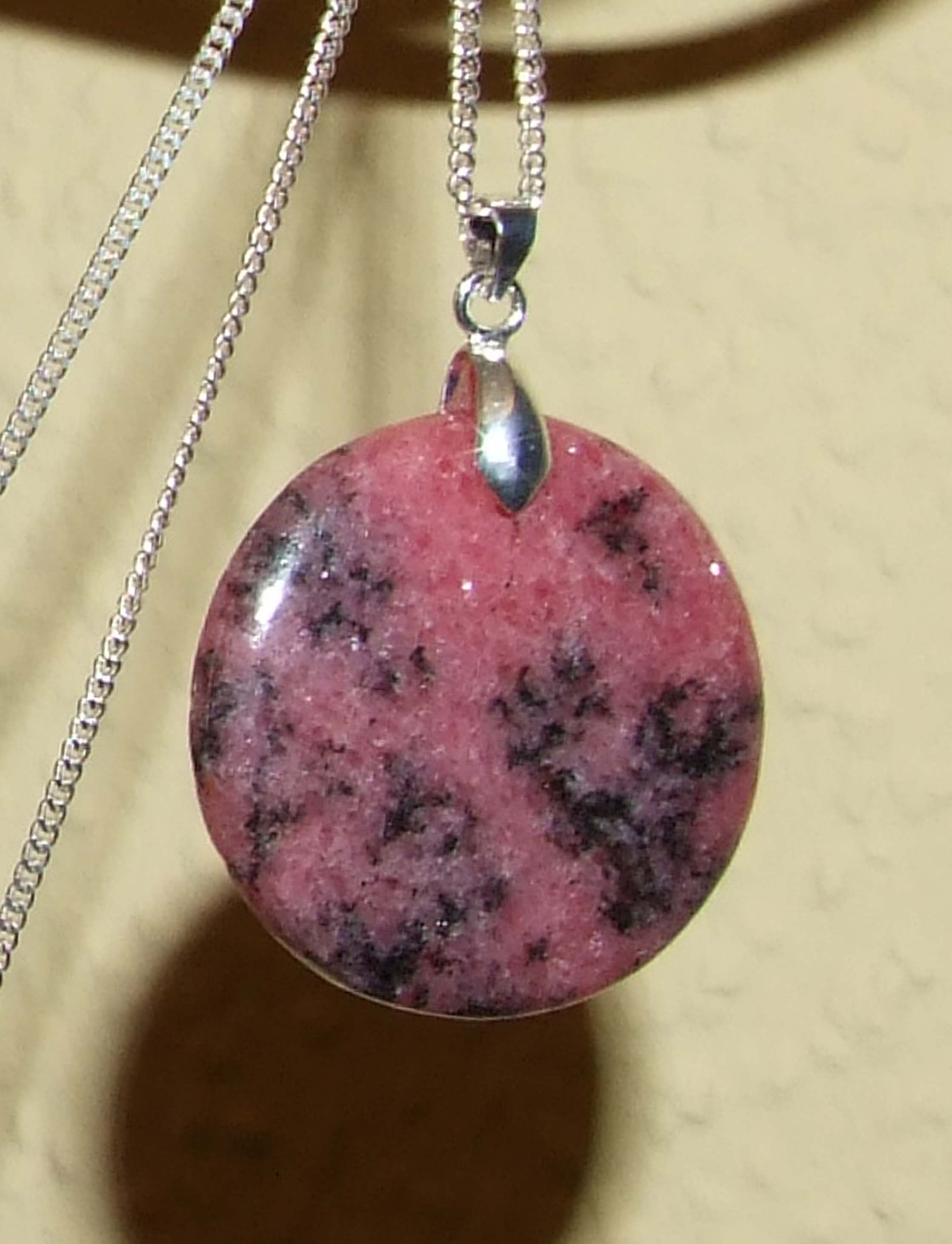 Nun ist es Rhodonit, getragen an einem kurzen schwarzen Lederband.