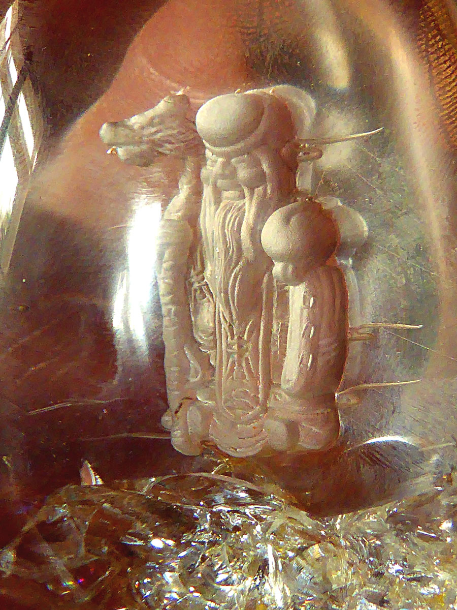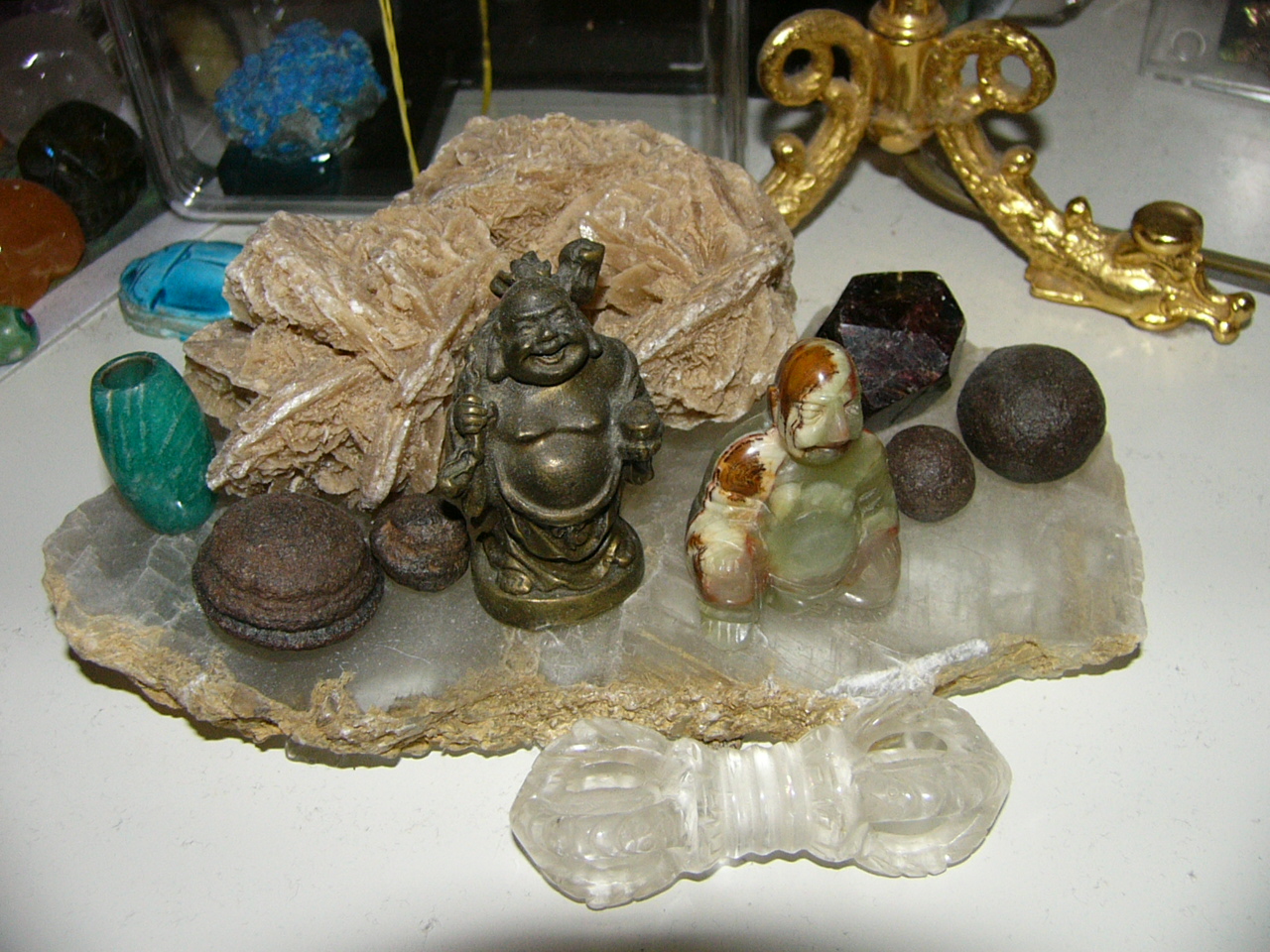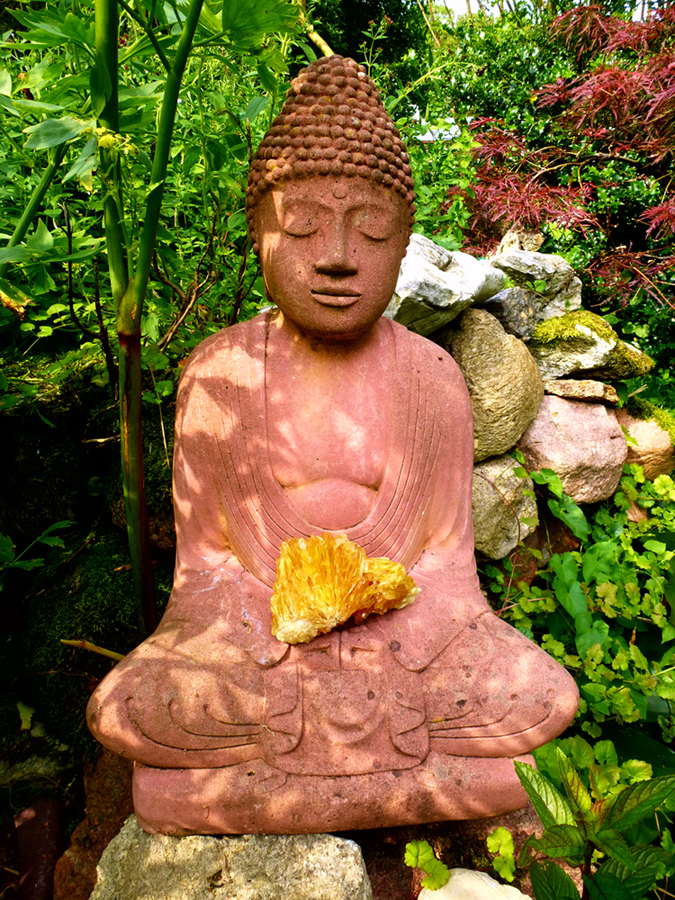 Ein Buddha ist ein Erwachter. Das Sanskritwort bezeichnet im Buddhismus einen Menschen, der Bodhi (wörtlich „Erwachen“) erfahren hat, Von da her stelle ich ihn hier mit dazu. Er ist von hinten in den wunderbaren Kristall mit Limonit eingeschliffen, und der Limoniteinschluß ist wie eine Blume und funkelt je nach Lichteinfall regenbogenfarbig vom feinsten.