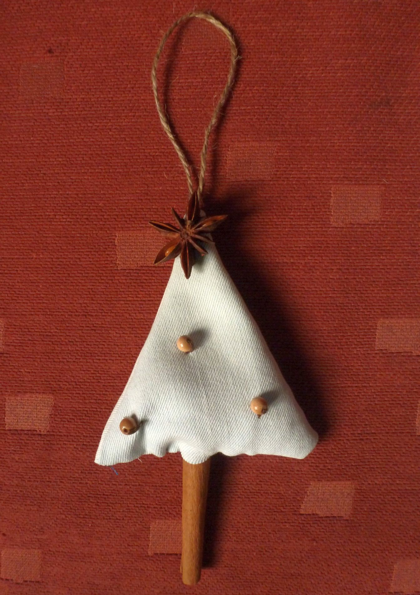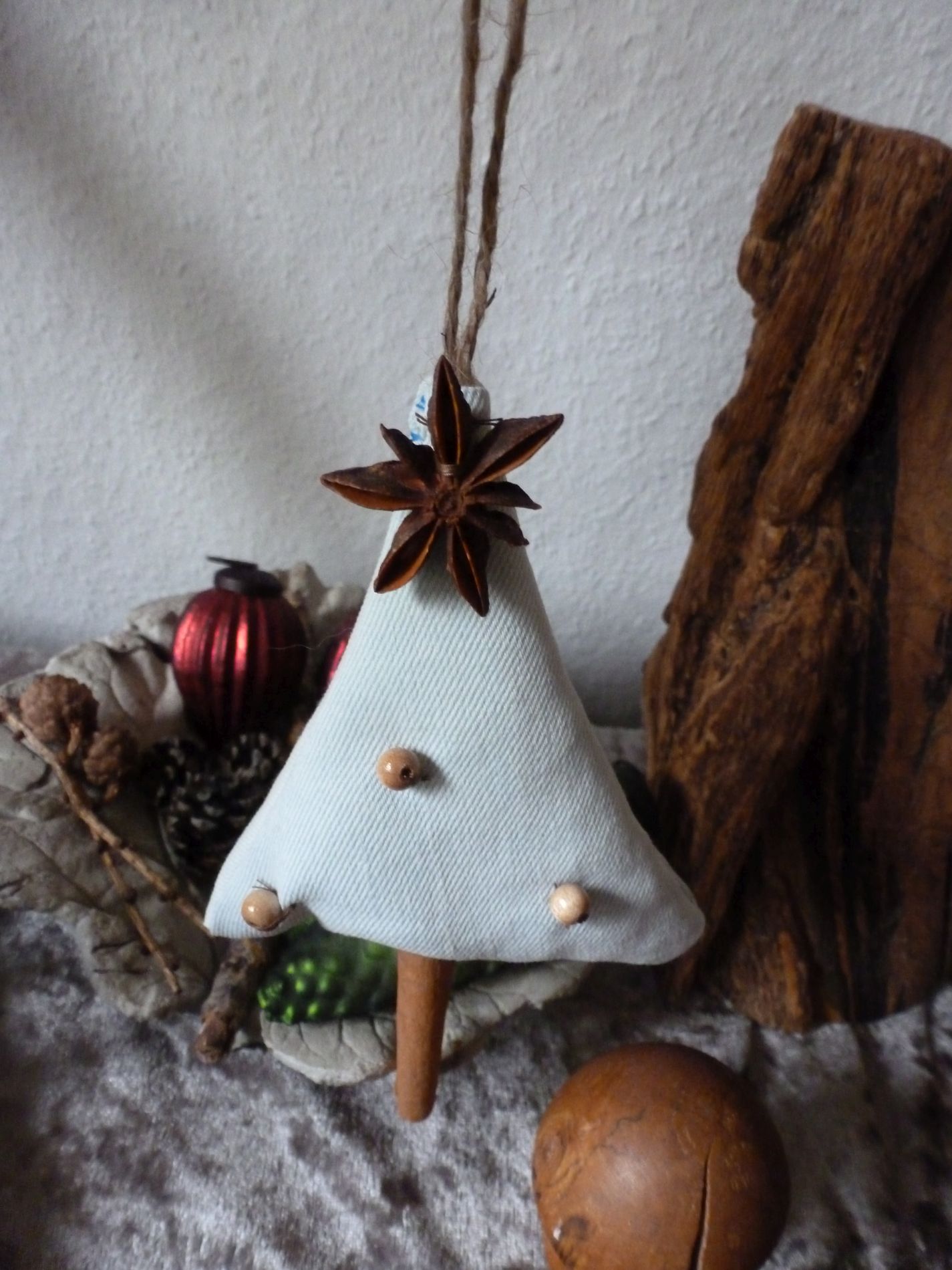 Ich habe gerade den ersten Tannebaum fertig. Gefüllt mit Nelken, Wacholderbeeren und Getreideschalen (die, die man auch zum Kissen stopfen nimmt). Als Stamm eine Zimtstange und als Spitze Sternanis.