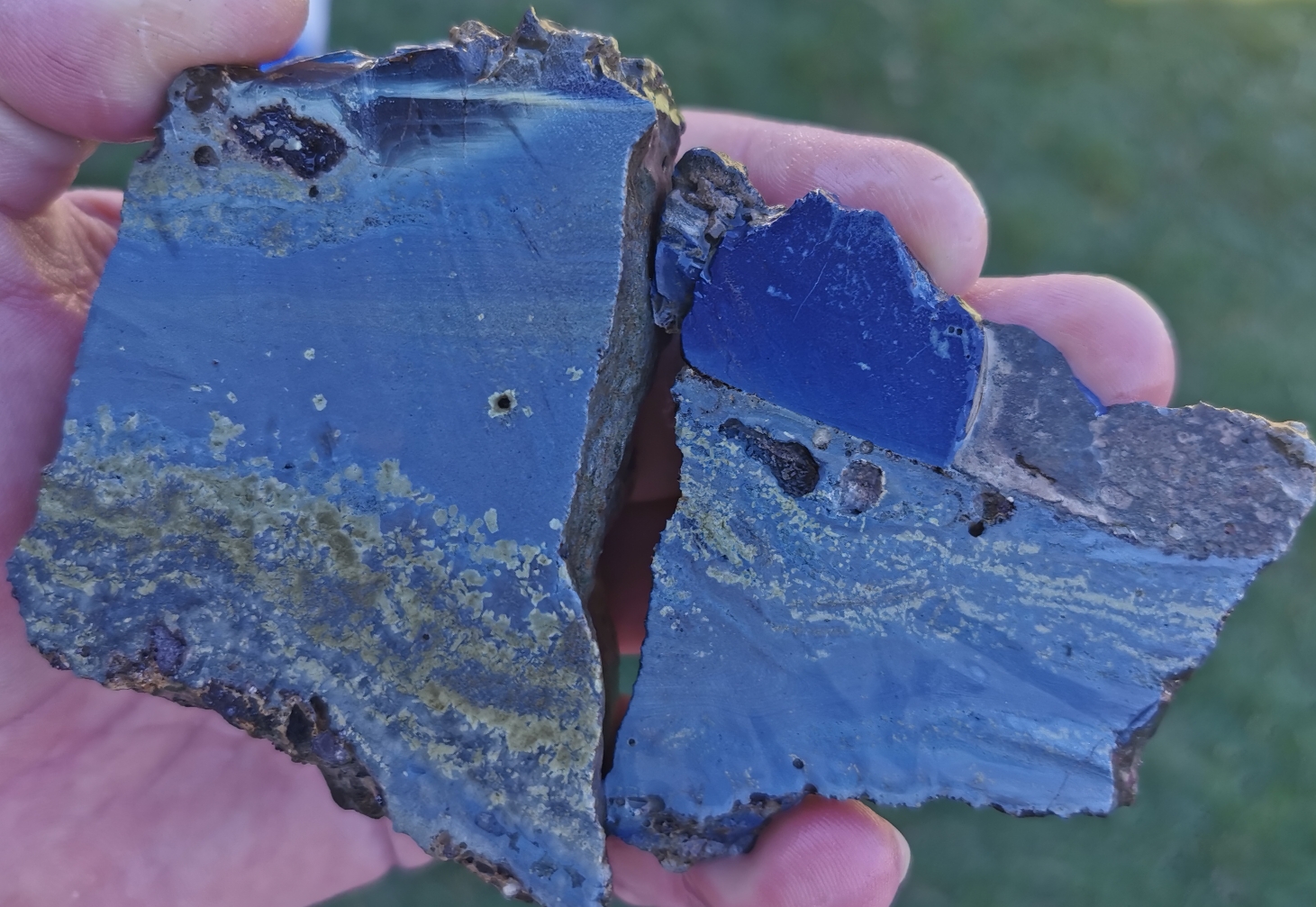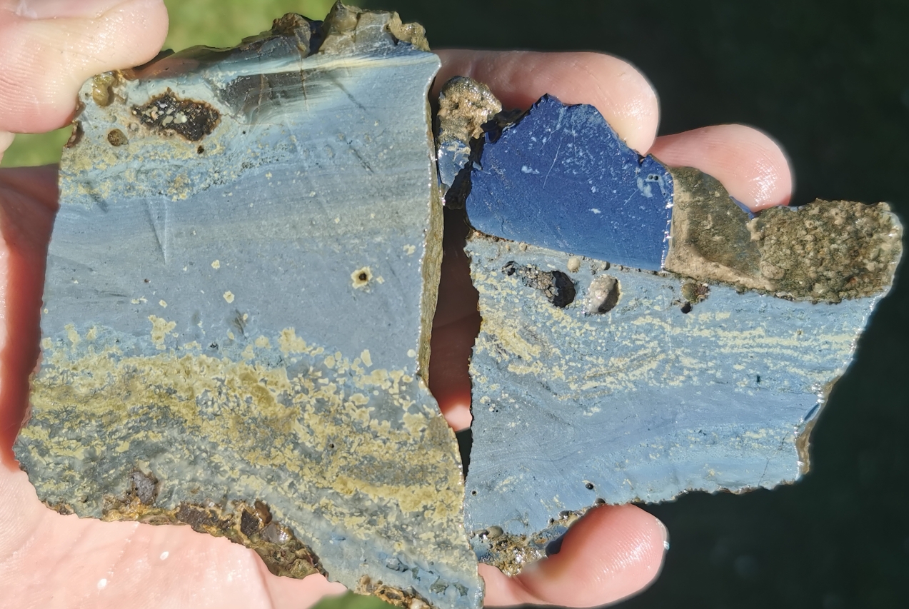 Ich habe von der Schlacke jetzt endlich einmal etwas aufgeschnitten und siehe da, auch wenn das meiste grüne Schlacke seien dürfte, so habe ich auch blaue dabei.