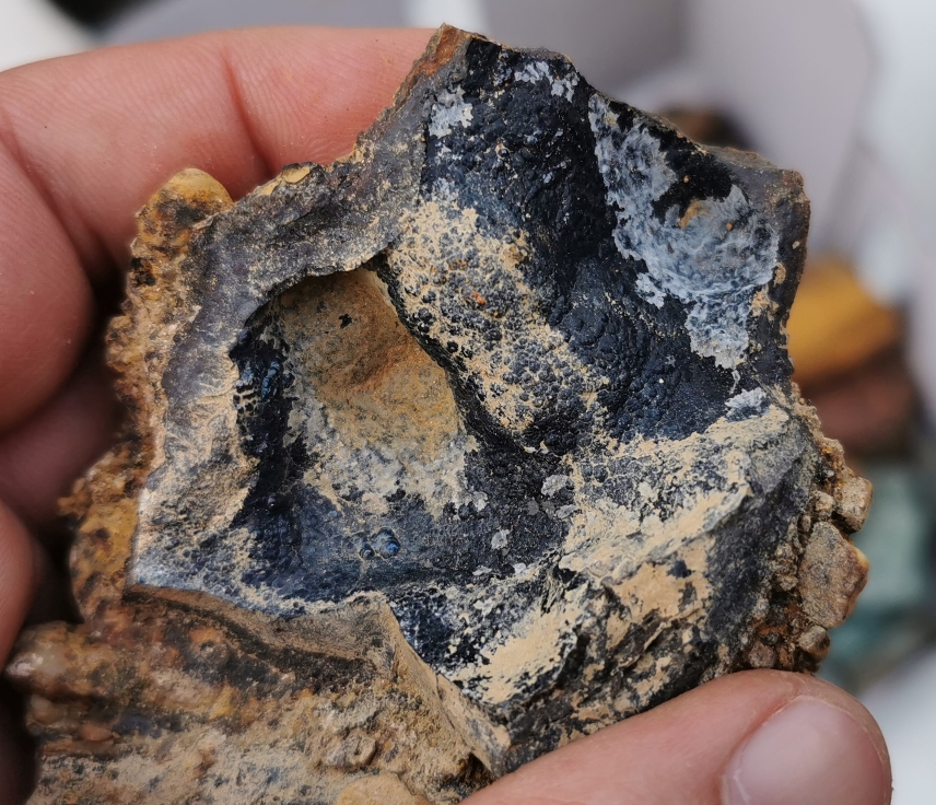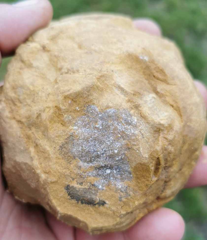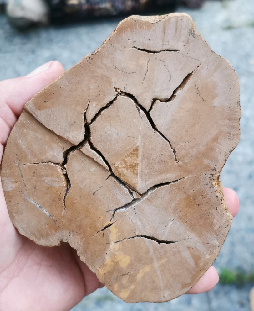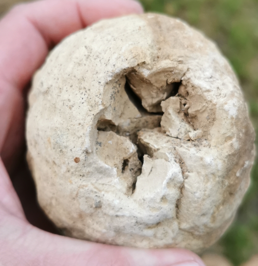 Womit ich wirklich nicht gerechnet hätte, sind meine letzten Fundstücke. Mein bekannter gab mir einen dieser eher unscheinbaren Steine und sagte, hau da mal mit dem Hammer drauf. Dies tat ich sehr zaghaft, da ich nicht mit dieser Stabilität gerechnet hatte. Daraufhin gab ich ihn den noch komplett intakten Stein zurück und sagte, dass er dies lieber machen sollte. Also haute er kraftvoll mit seinem Hammer darauf. Es ist nur ein kleines Stückchen davon abgebrochen, aber er war damit sehr zufrieden. So reichte er mir den Stein zurück und sagte, dass ist eine Septarie und mit etwas Glück ist sie auch gefüllt