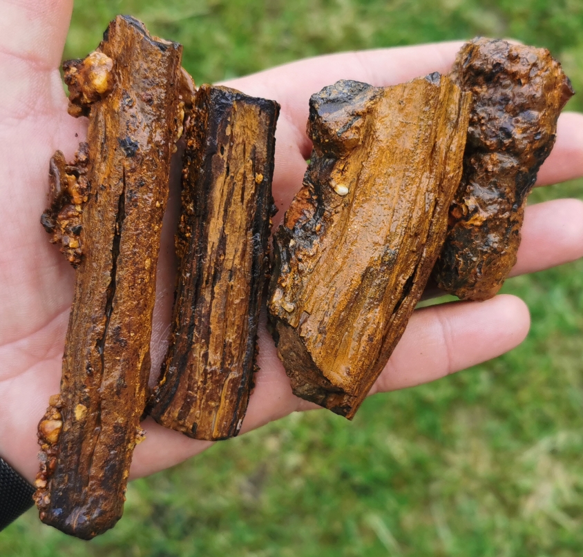 Links das Stück kann man sehr gut als Ast erkennen. Der zweite von links ist ein mittig geteilter Ast, wo man sehr schon die Rinde und dass innenleben sehen kann. Der rechts danaben hat noch die komplette und unbeschädigte Rinde drumherum.