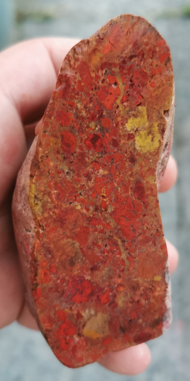 Alles rote ist Jaspis (ein wenig davon ist aber auch Blut-Eisen) und alles gelbe ist Hornstein. Irgend einer, der kleineren gelben Stücke ist sogar auch ein Jaspis
