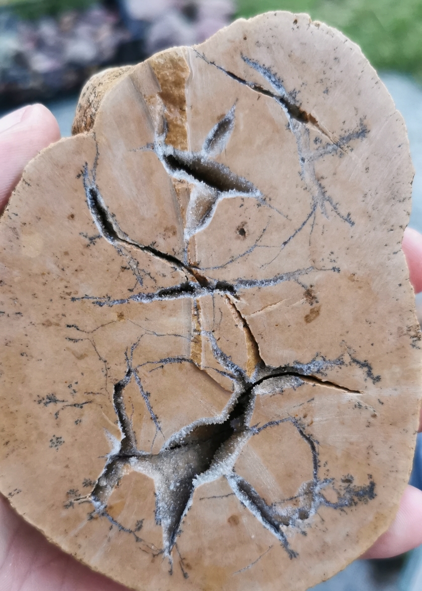 Beim Austrocknen entsteht im inneren ein Holraum Schrumpfungsrissen, der sich mit unterschiedlichen Mineralien füllen kann. Dadurch hat die Septarie dieses spitze Spaltenformat. Ich hoffe, dass war zumindest etwas verständlich