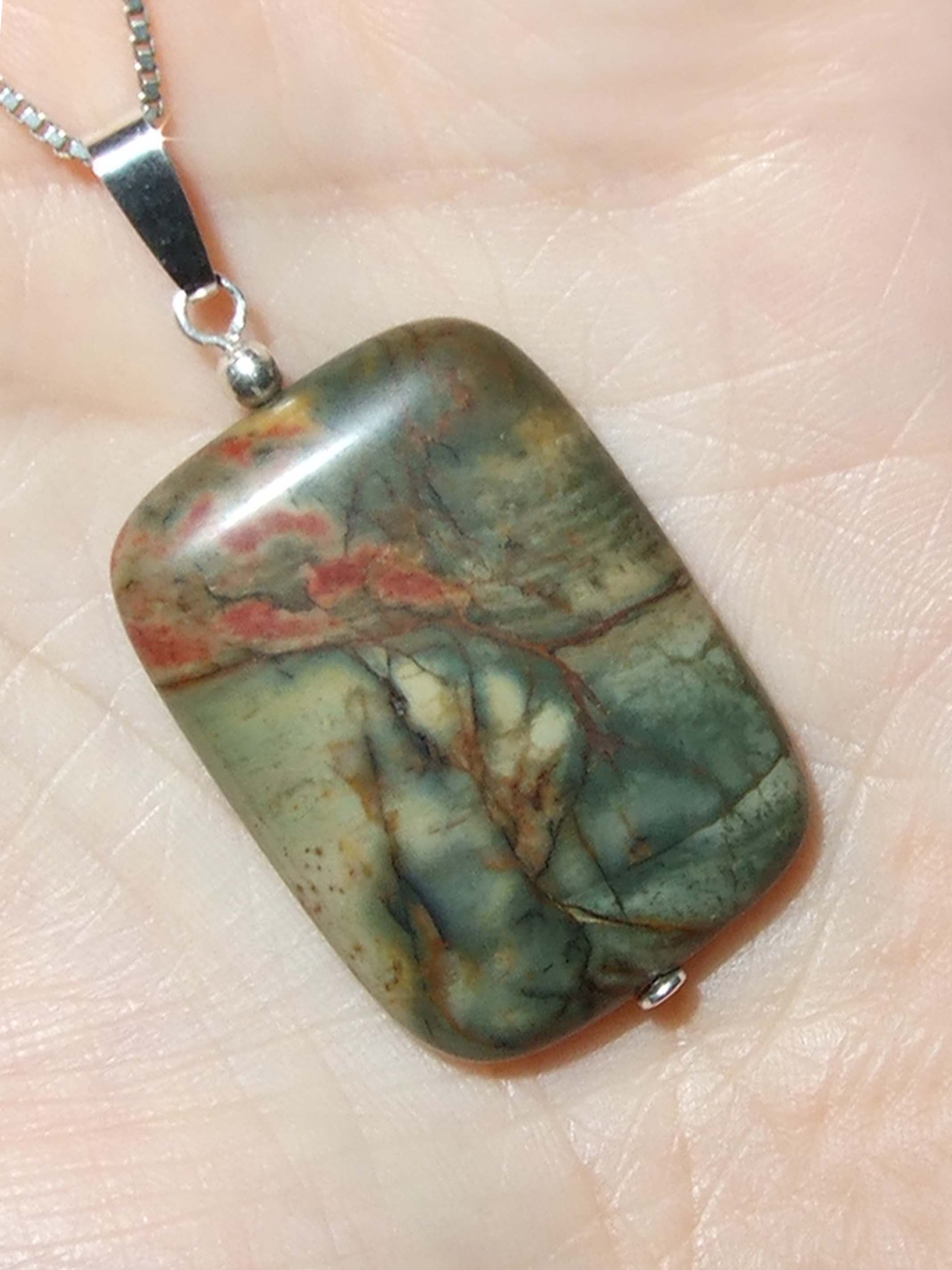 Gekauft hatte ich ihn an einem Strang mit anderen Steinchen als "Polychronic-Jaspis". Aber ich denke eher, dass es ein Red-Creek-Jaspis ist. Nach Recherchen bin ich mir da ziemlich sicher.