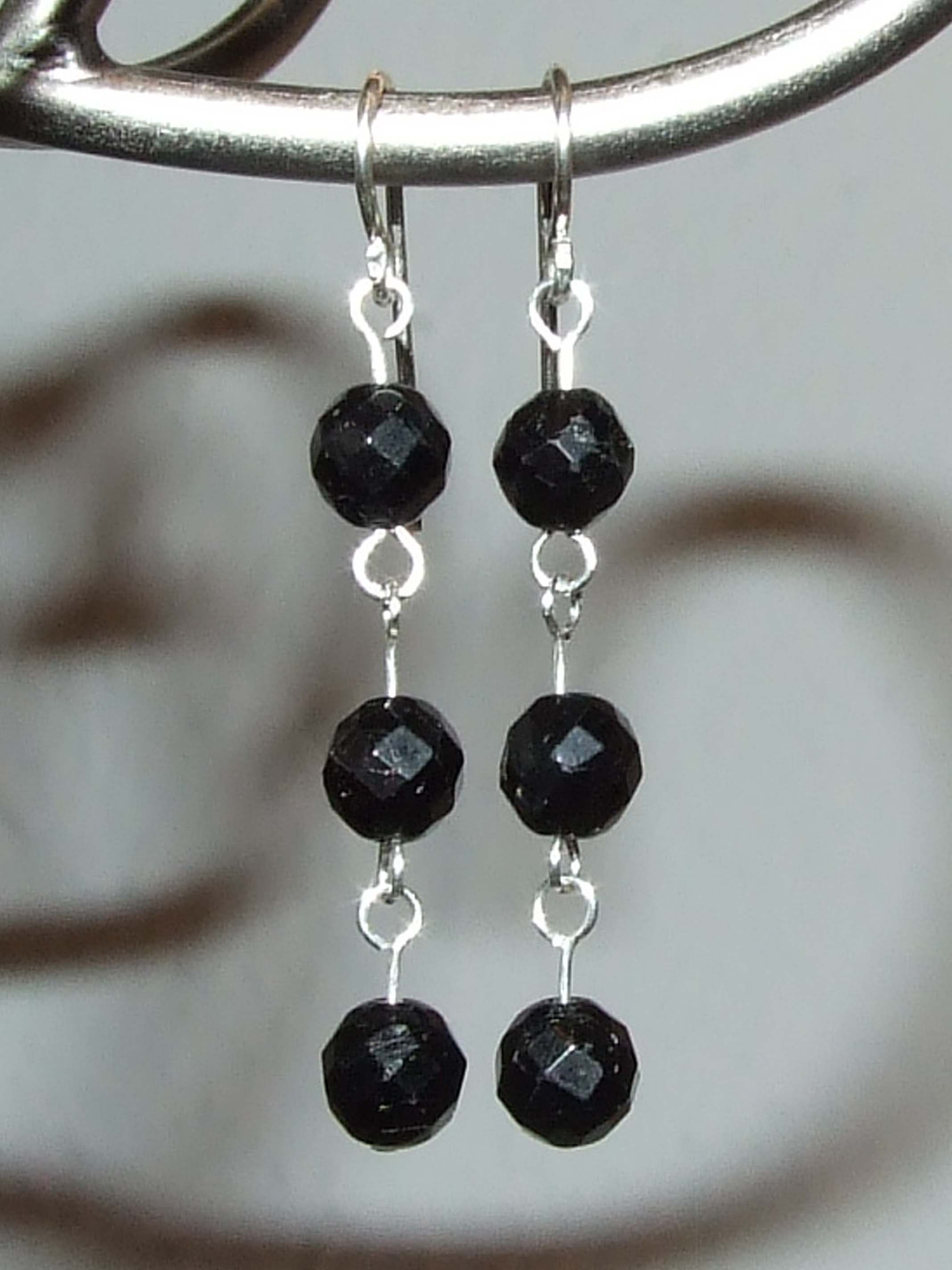 Diese kurze Kette habe ich nur vorn mit sieben Schörlkügelchen bestückt. Und bei den Ohrhängern habe ich inzwischen auch eine Kugel entfernt, da mir das etwas zu lang baumelte. So gefällt es mir besser.