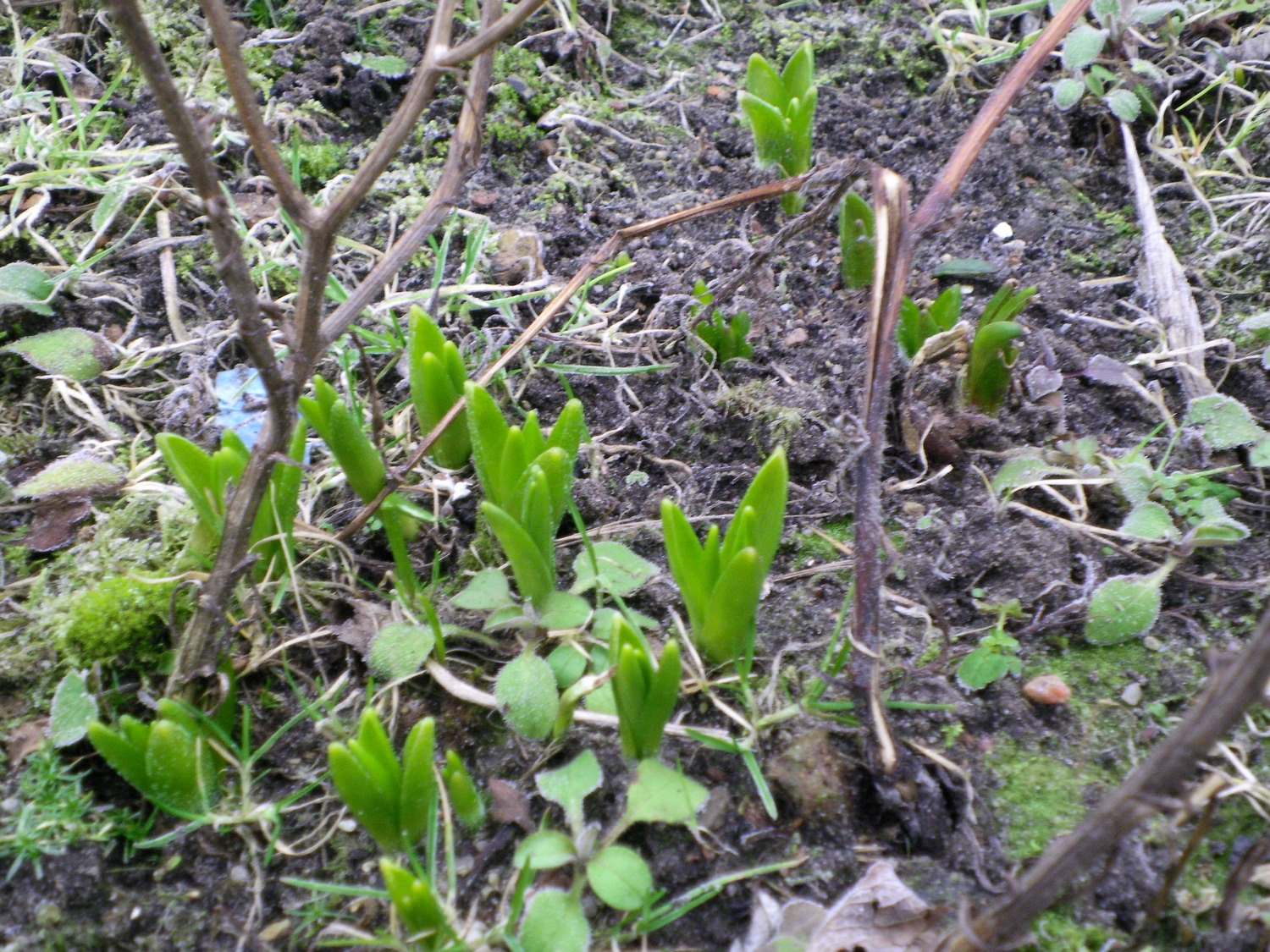 Narzissen und Tulpen durchstoßen das Moos Bei dieser Kälte haben die Winterlinge keine Lust aufzuwachen Der Rhabarber stößt durch Tulpen auch Irgendeine Minze Und Hyazinthen Zitronenmelisse, Milchstern und Wilderdbeeren, die meinen ganzen Garten in Beschlag genommen haben....