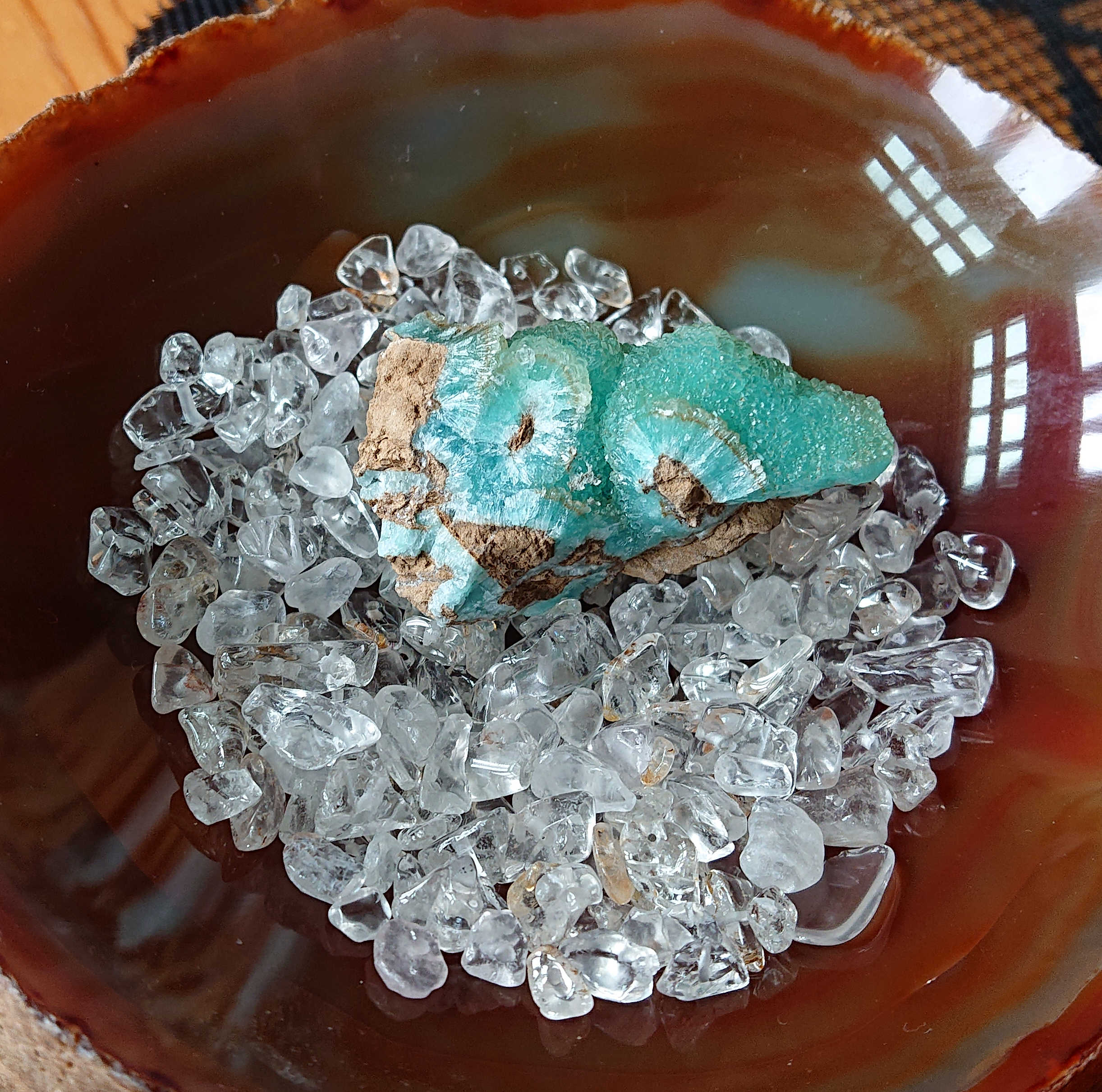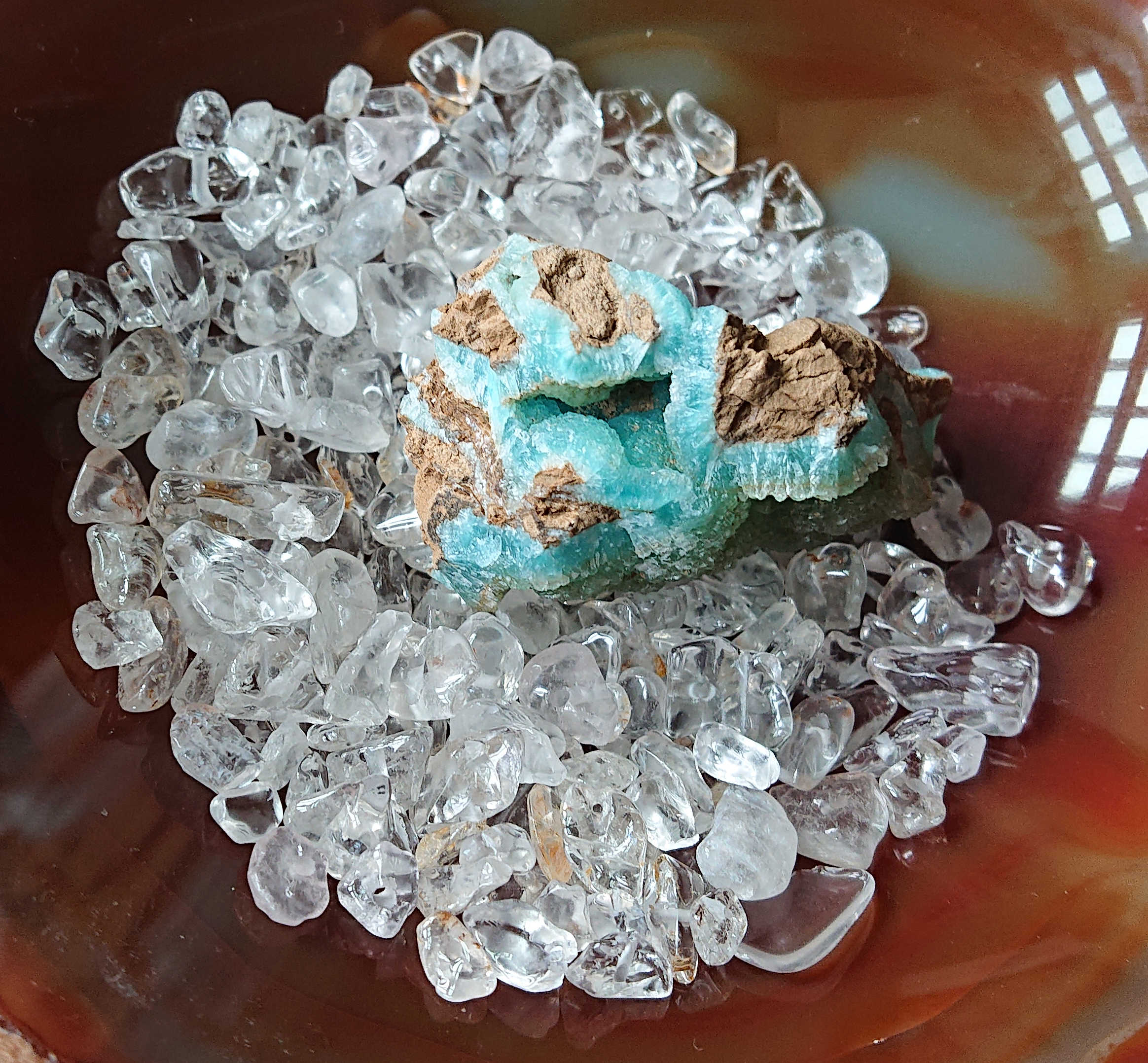 Reinigung: direkt nach der Behandlung von Hautkrankheiten unter Fließwasser, sonst 1x monatlich unter Fließwasser, aufladen im Vollmond oder in einer Amethystdruse.