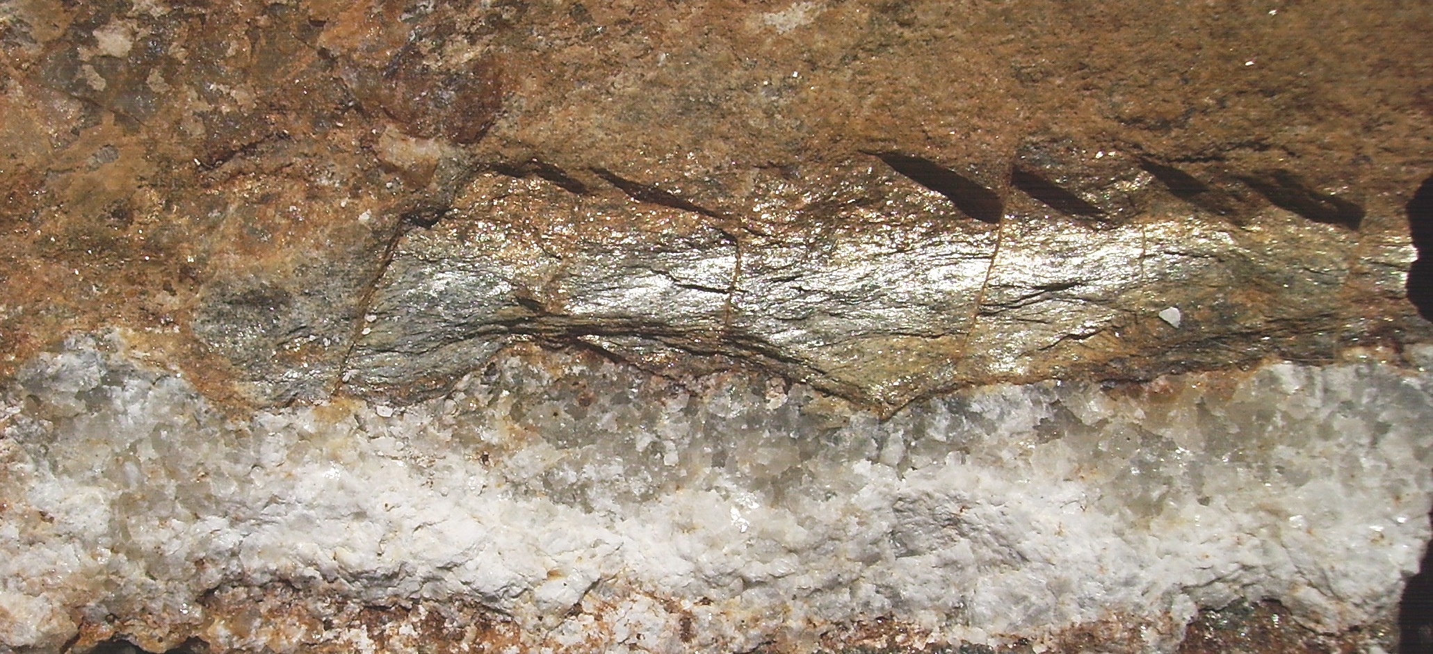 und in diesem Brocken , da sind beide Gesteine vereint, Calcitmarmor mir Kristallen um 1 mm und glimmriger Schiefer.