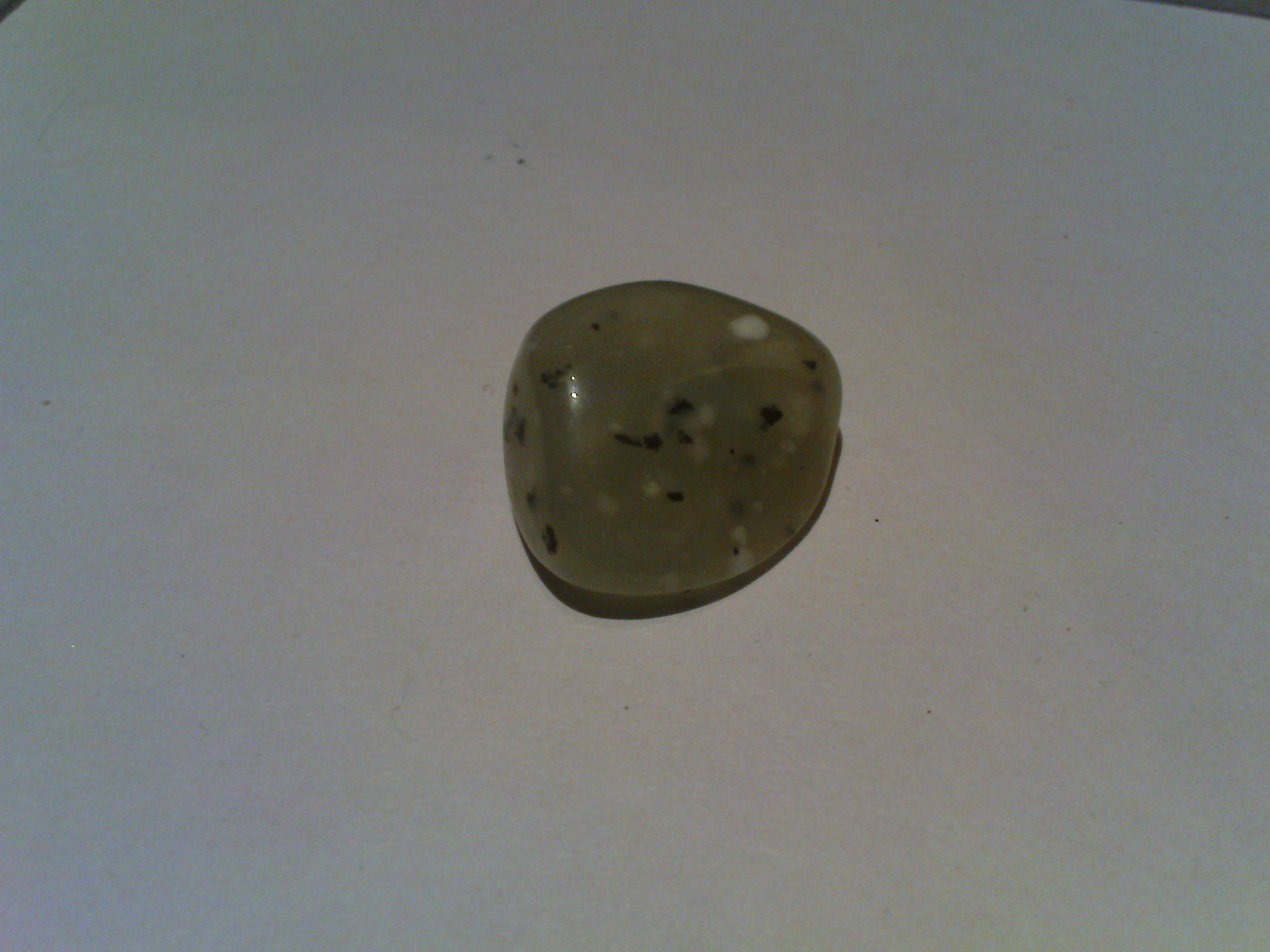nochmal was Neues, was ich noch nicht einsortieren konnte. Ganz hellgün, durchscheinend mit schwarzen und weißen Flecken (die schwarzen sehen teilweise aus wie irgendwelche Stückchen) drin.