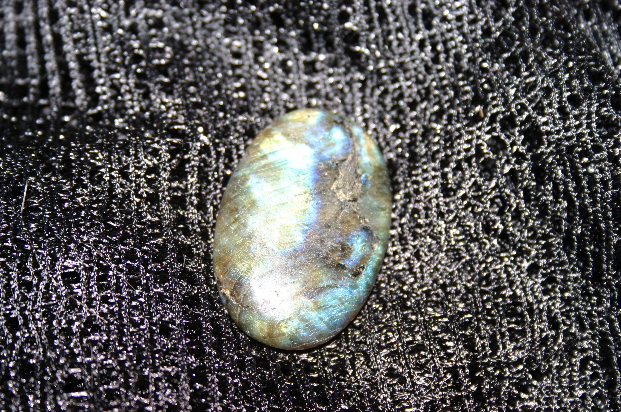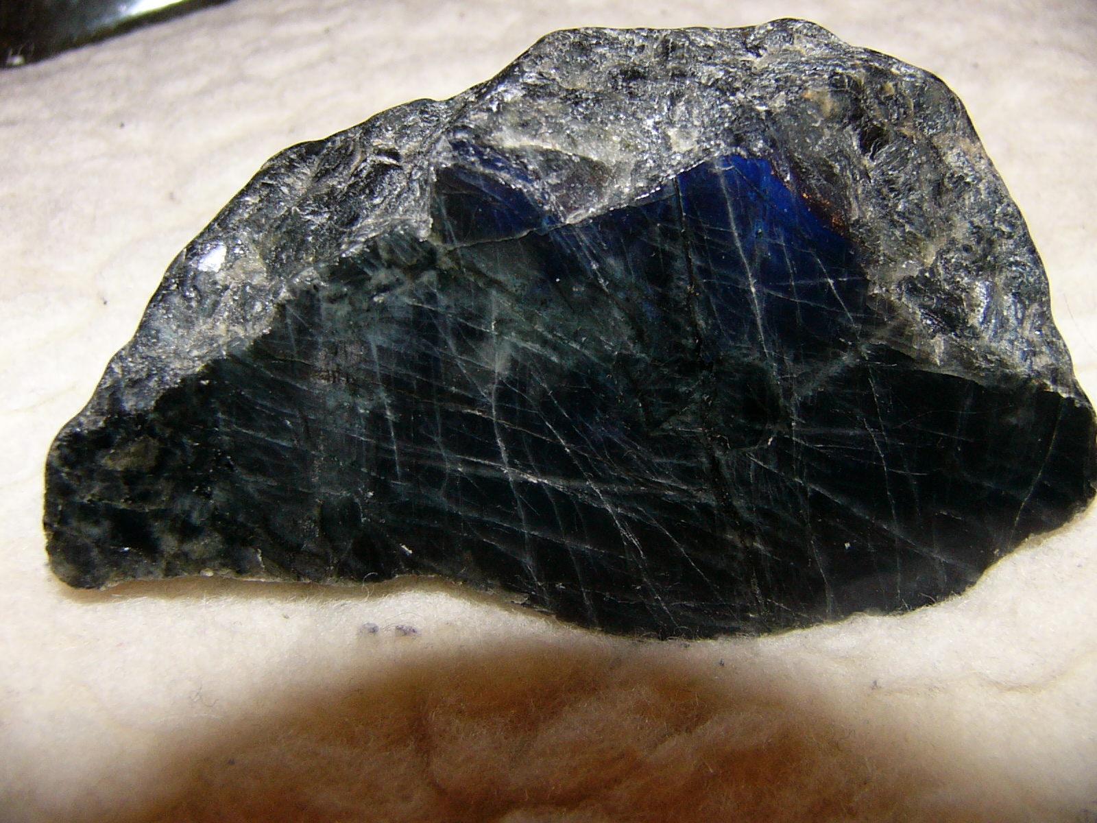 Seit heute mein... ein schönes, vorne halbrund angeschliffenes Stück, etwa so groß wie meine Handfläche (ohne Finger natürlich). Leider gibt er seinen Schimmer nicht so ganz preis, aber auch so finde ich ihn wunderschön...