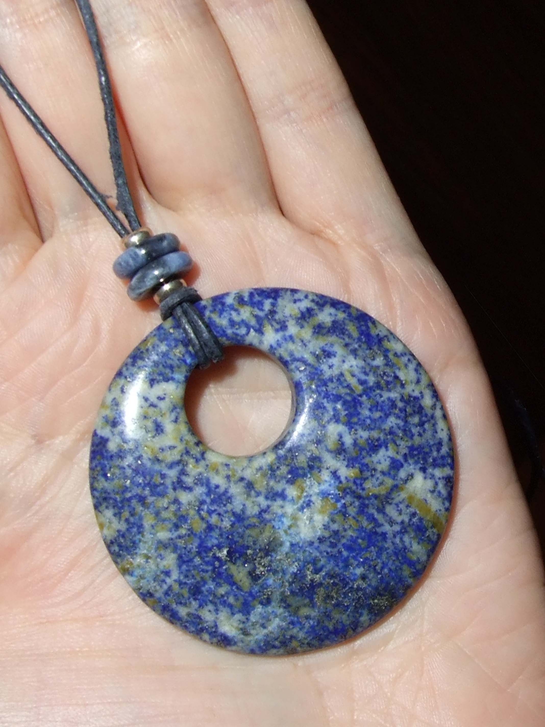 Hier zeige ich euch meinen Lapislazuli-Donut, welcher 5 cm misst und schon sehr alt ist. Ich habe ihn in den 1990er-Jahren mal auf dem Markt gekauft. Ich trage ihn noch immer sehr gern.