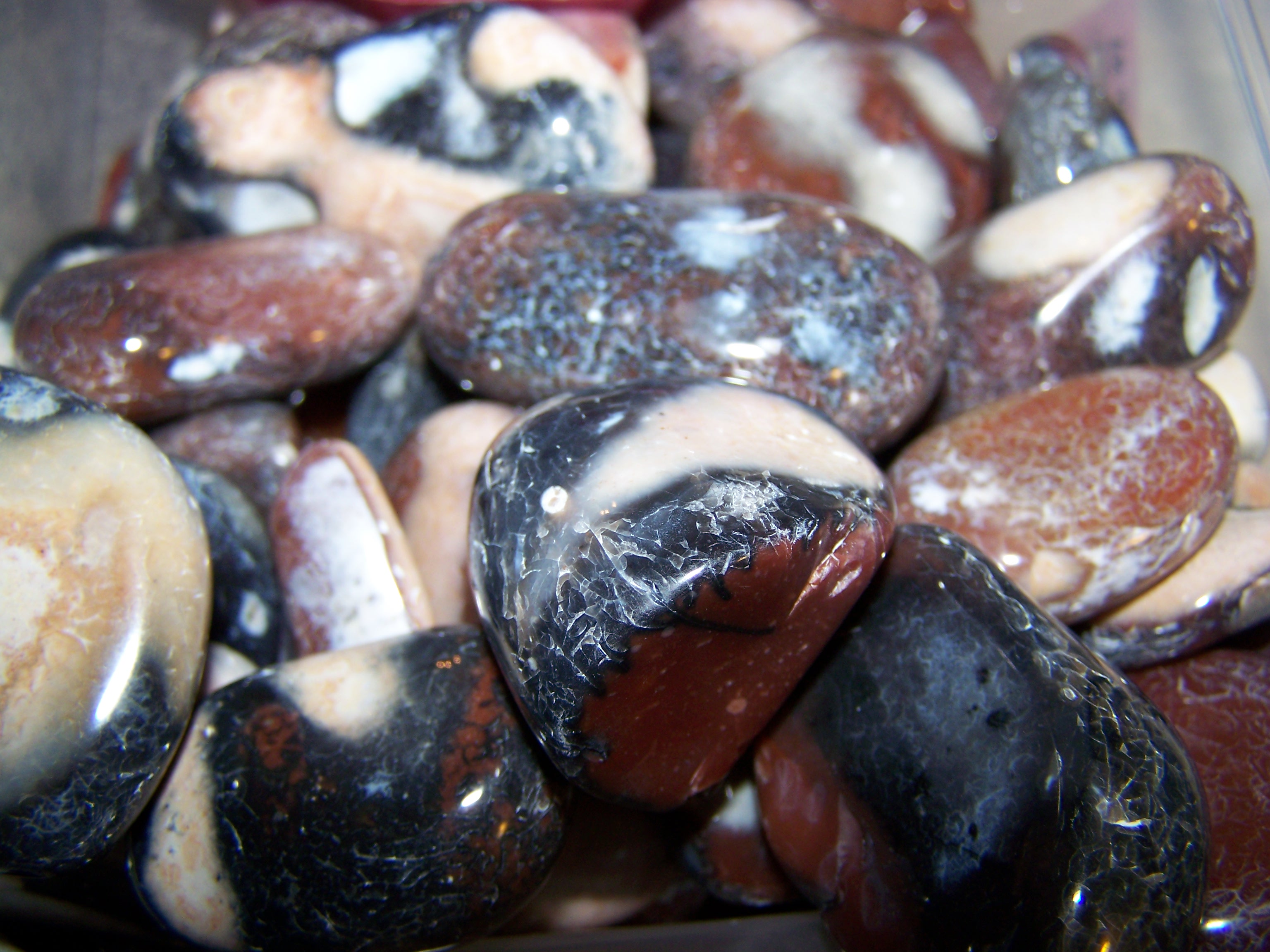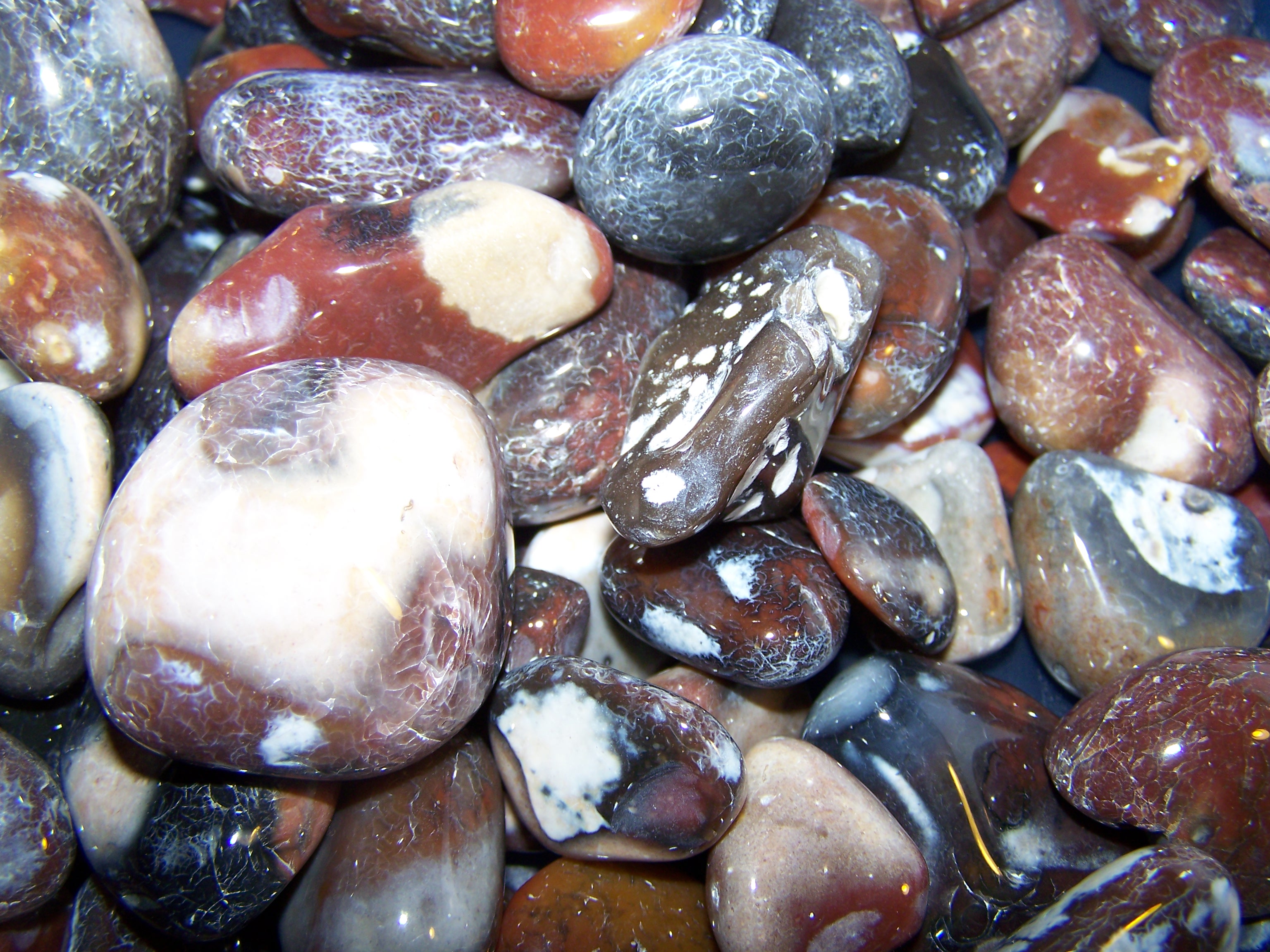 So - für die Neugierigen! Hier meine ersten getrommelten Steine. Leider kommt auf den Fotos die Brillanz nicht wirklich rüber - mag daran liegen, dass Blitz und Lampe etwas verfälschen. Werde bei Gelegenheit nochmal Sonnenfotos machen!