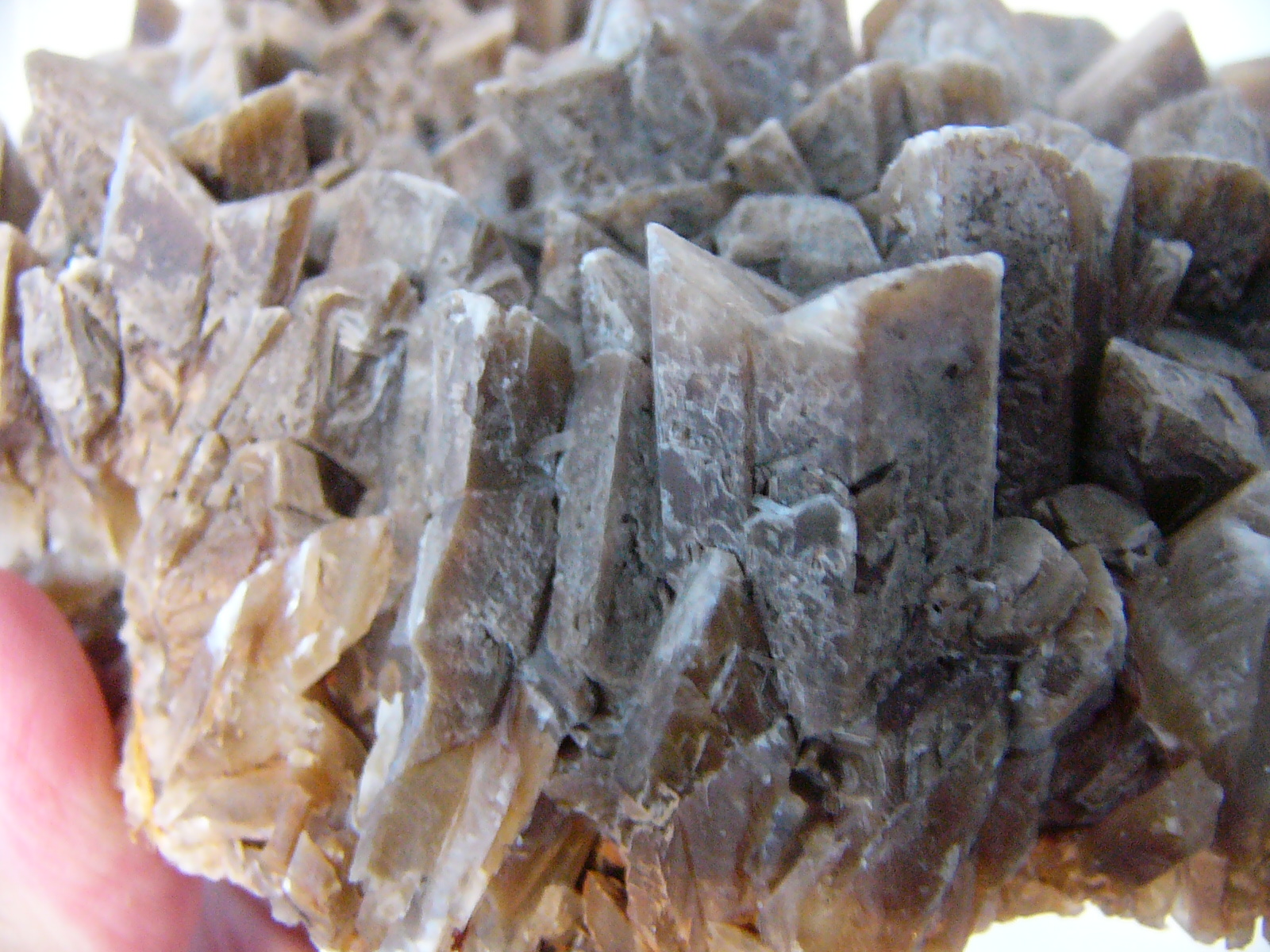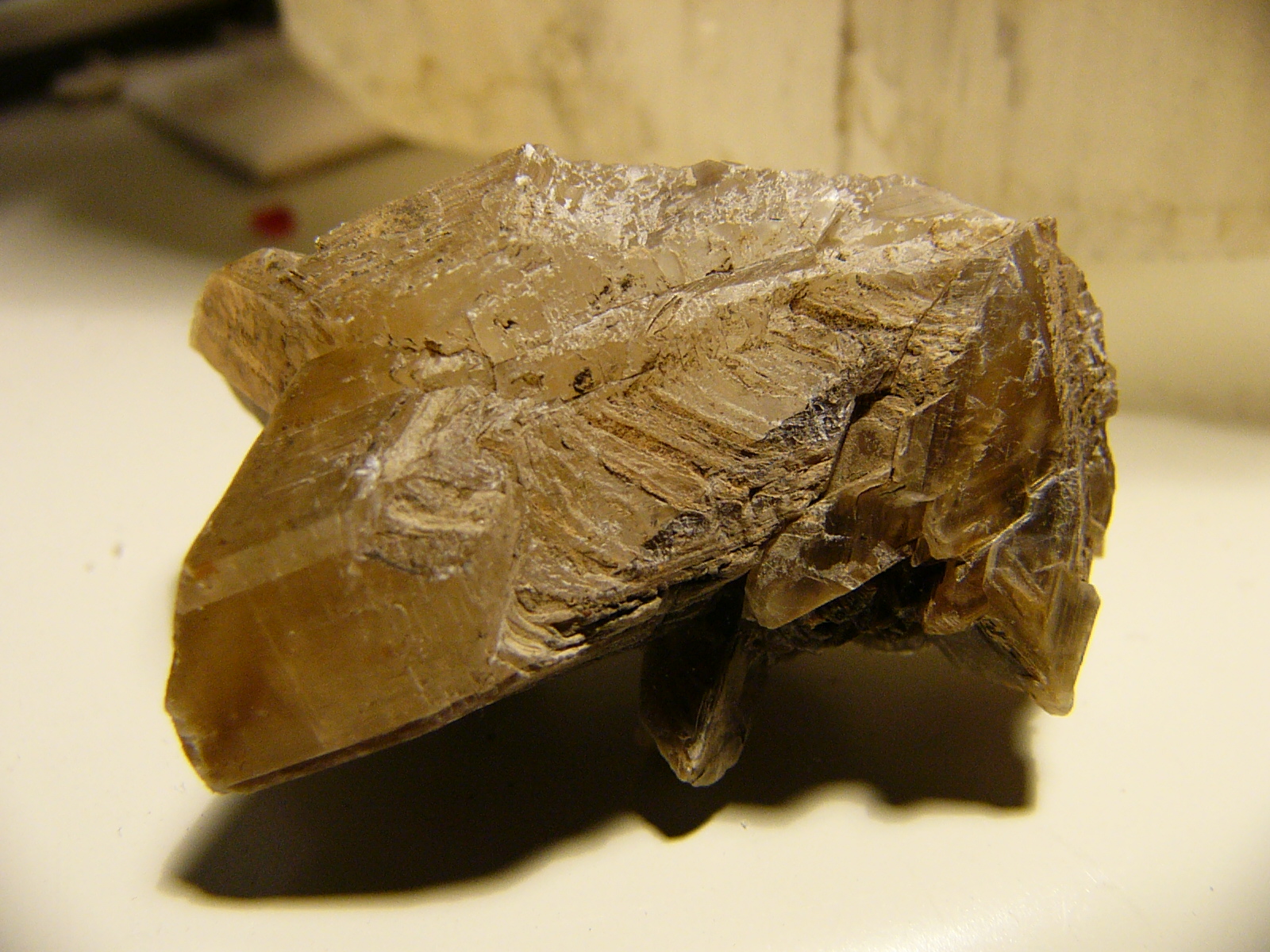 von der kristallstruktur (bei der ich auch meine, mitunter sog. 'schwalbenschwanz-zwillinge' zu erkennen), als auch vom glanz u. seiner ganzen struktur, denke ich eher, daß es sich um eine gips-stufe handelt. - gips ist übrigens im gegensatz zu baryt sehr leicht.