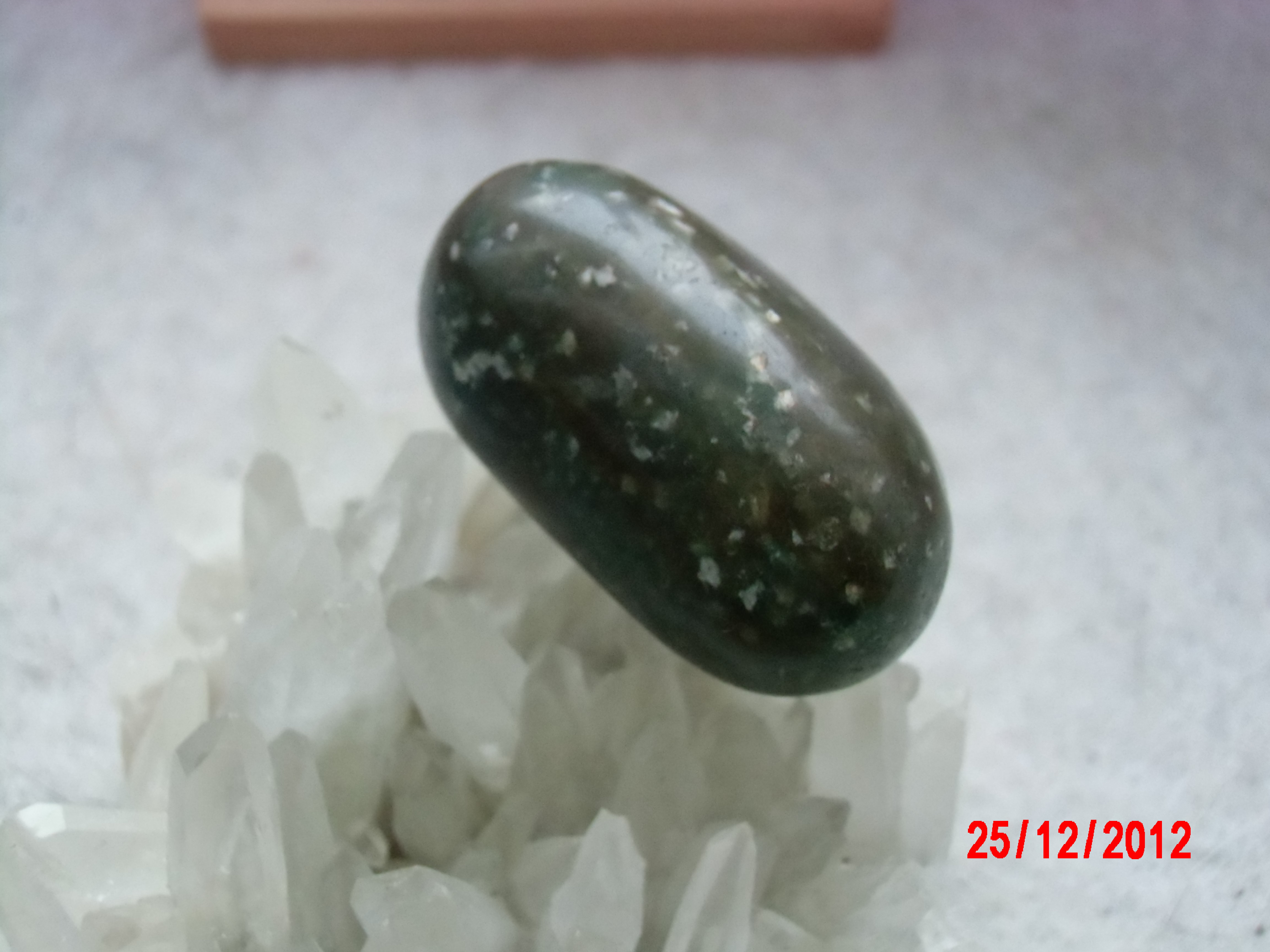 beim besuch vom Weihnachtsmarkt wollte dieses Steinchen unbedingt mit von der einen Seine hat es einen leichten blaugrünen Schimmer von der anderen Seite ist es grün,rotbraun und hat viele kleine wieße Pünktchen.