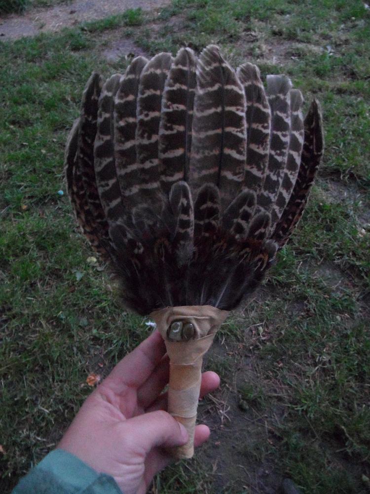 Diesen haben wir auch mal selber gemacht. Eine Seite Fasanenfedern vom Großvater (auch das Horn) und andere Seite gefundene Rabenfedern (nisten in den Eichen vor dem Haus und Taubenfedern.
