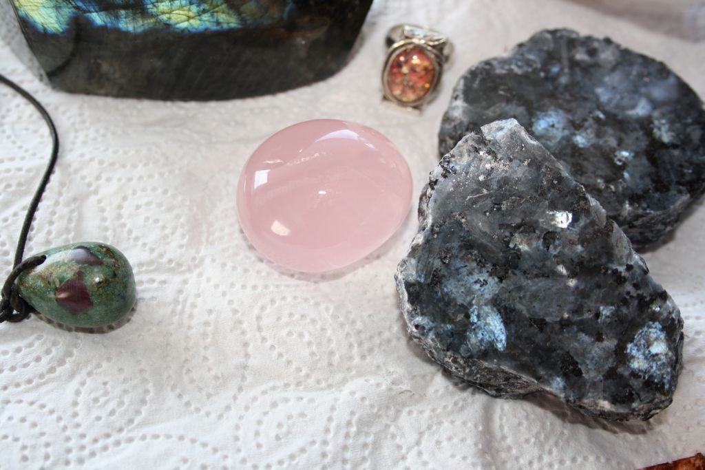Labradorit, Bergkristallstufe, 925 Silberring(für meine zierlichen Finger +++# ), Zoisit-Rubinanhänger, Rosenquarzhandschmeichler und 2 Steine, ich denke die kommen aus der Gegend von Helmut, ???Wunsiedler Marmor ?????, auf jedenfall ein klasse Stein und es waren keine Händler.