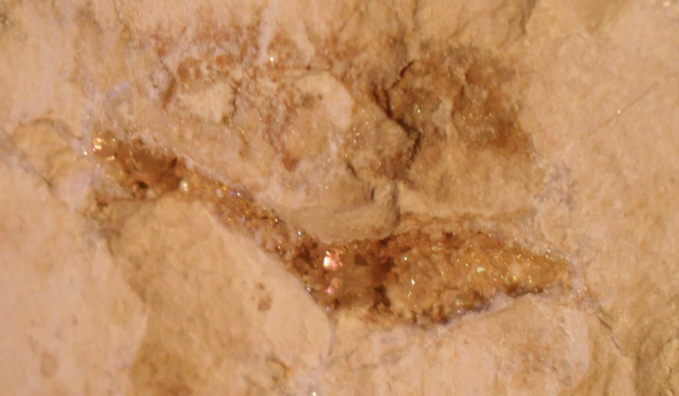 habe in Solnhofen einen Calcit( Honigcalcit?) gefunden, der in allen Regenbogenfarben schimmert... Leider will die "Diva" sich nicht so richtig fotographieren lassen....Der schimmert im Licht wirklich in sämmtlichen Farben.