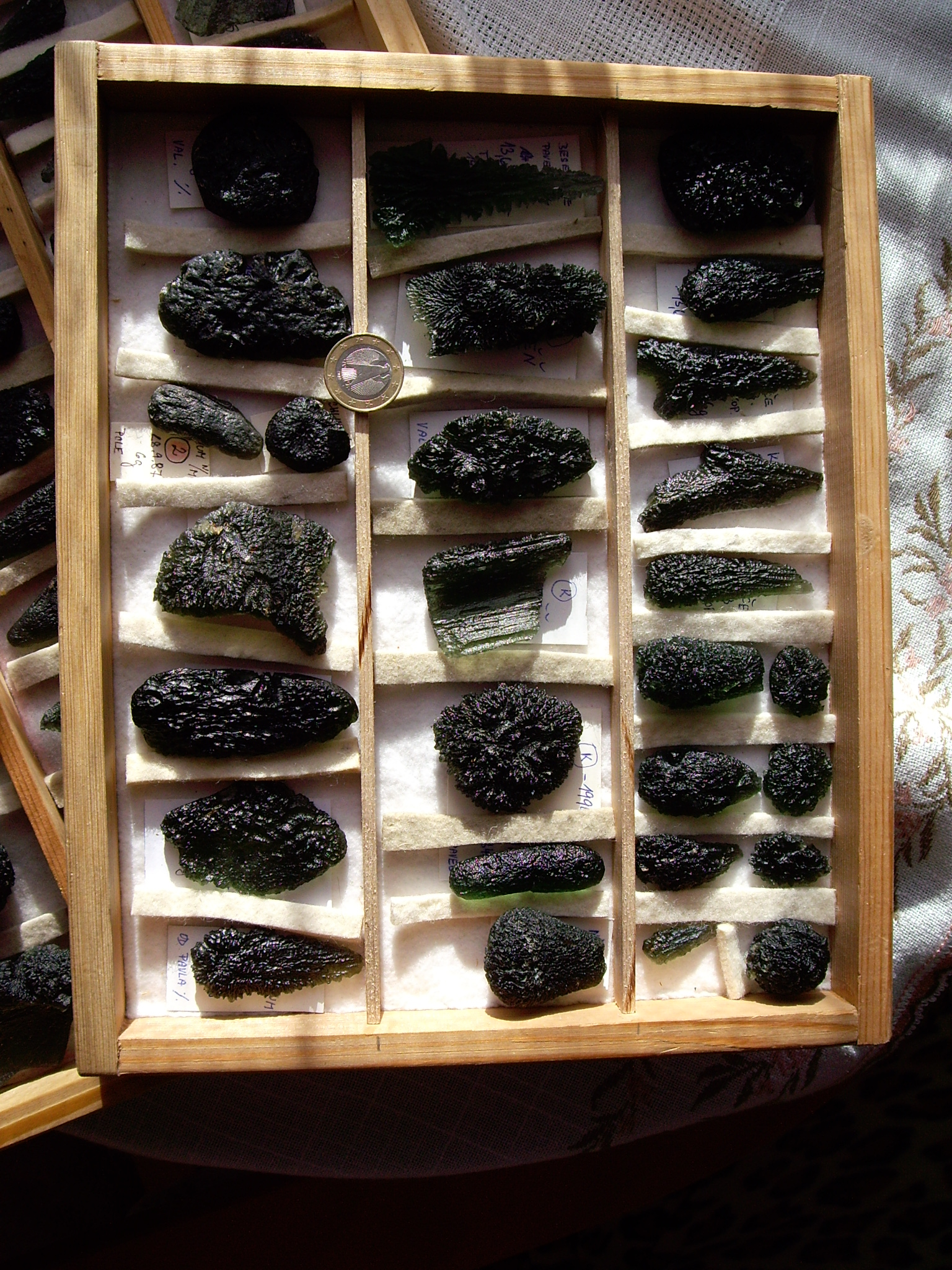 Hier ein Teil der angekündigten Moldavitsammlung meines tschechischen Freundes Hofhanzl aus Tust.