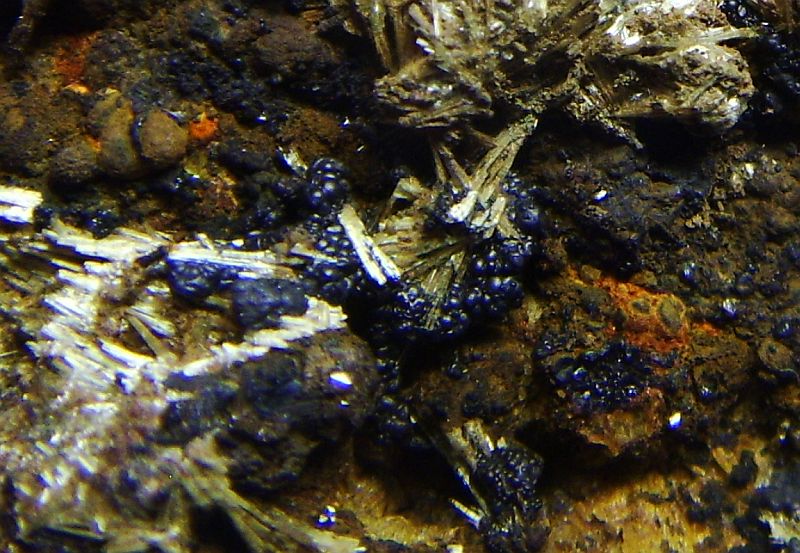 Ich habe noch ein Photo: Das zeigt neben den Strunzit Nadeln auch "Einblicke" in die Matrix dazwischen. Man kann gut sehen, wie der schwarze Rockbridgeit sich zusehends in rotbraunen Limonit umwandelt; also durch Verwitterung regelrecht zerfressen und so teils von rotbraunen Eisen-Verbindungen ersetzt wird.