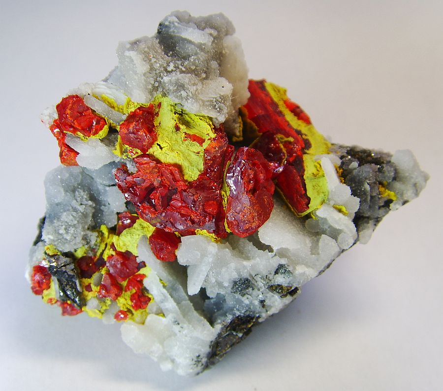 Roter Realgar teils mit gelbem Auripigment auf Bergkristallen oder Quarz Matrix.