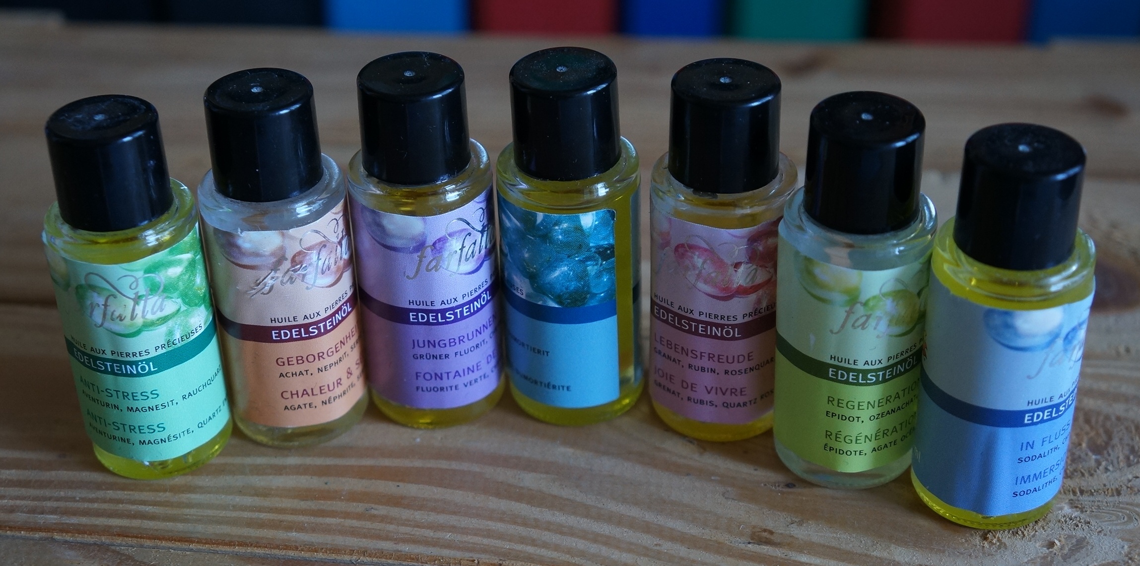 Sicherlich habt ihr die dazu passenden Edelsteinöle schon mal gesehen oder habt sie auch Zuhause. Es gibt 7 verschiedene Öle nach der oben genannten Zusammensetzung. Die Öle kann man übrigens auch "einfach so" mal benutzen und sich z.B. einen Tropfen auf die Schläfen oder so.