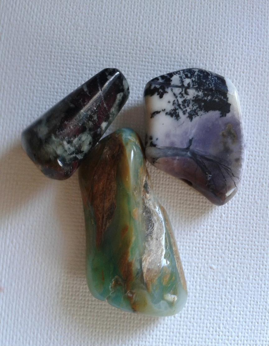 Das grüne ist ein Andenopal und das schwarz-rot-grüne ein Eudialyt.