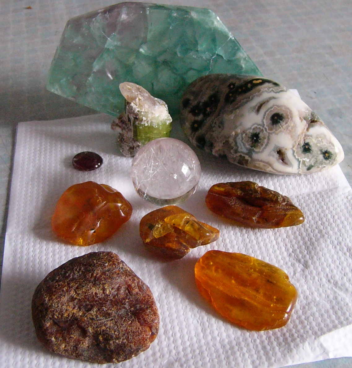 Gestern mal zum Einkauf, das musste alles mit.Flourit,Turmalin, Kugel mit Rutilnadeln,Ozeaner,Bernstein