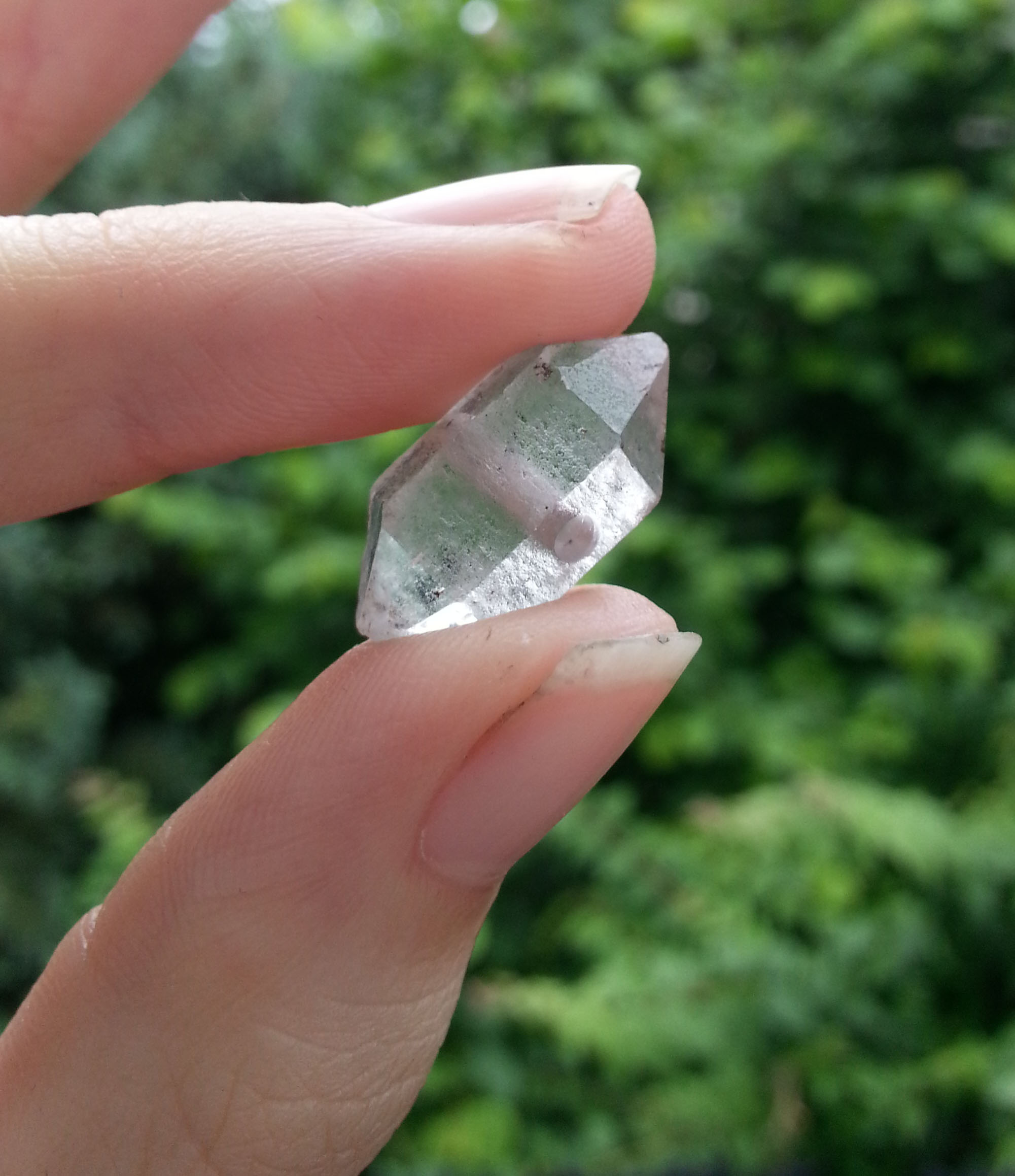 Leider nicht ganz so klar, da die Oberflächen nicht ganz glatt sind. So kann das Licht nicht in jedem Winkel hindurch. Aber er gefiel mit von der tollen Symmetrie einfach und dass er für ein Band gebohrt wurde.