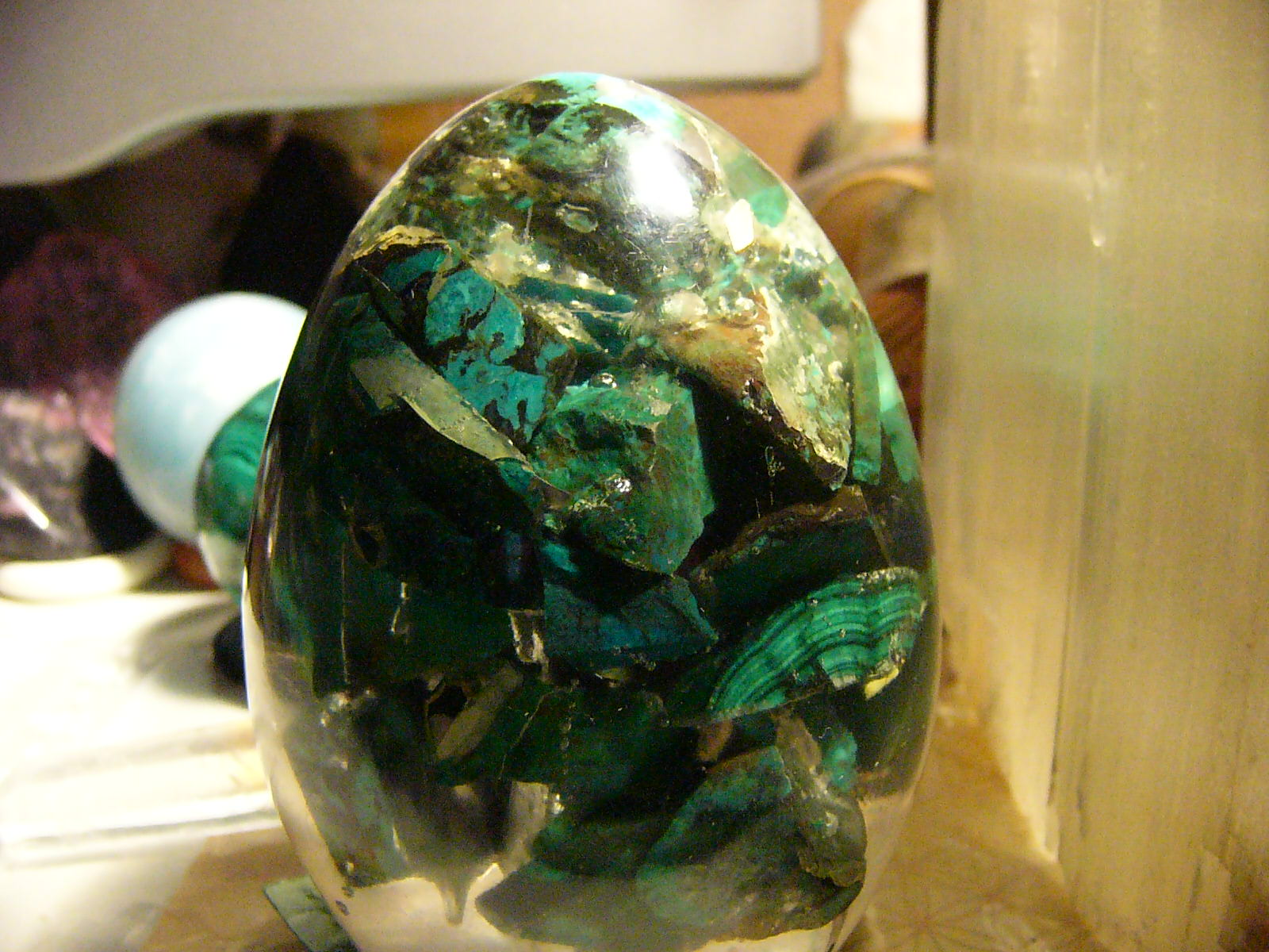 Habt Ihr so etwas schon mal gesehen ,es ist bekannt das ich Malachit mag aber so eingegossen,hm da hat sich mein Schenkender viel Arbeit gemacht nur ich war und bin nicht so begeistert .Hier mal zur Ansicht;-)