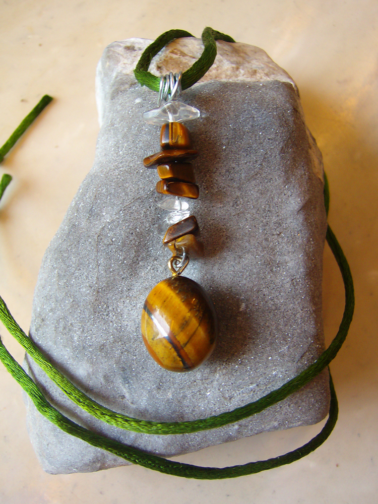 2. Multifunktionaler Anhänger aus Tigerauge (TS und Splitter) und Bergkristall, auf dem Bild an einem grünen
