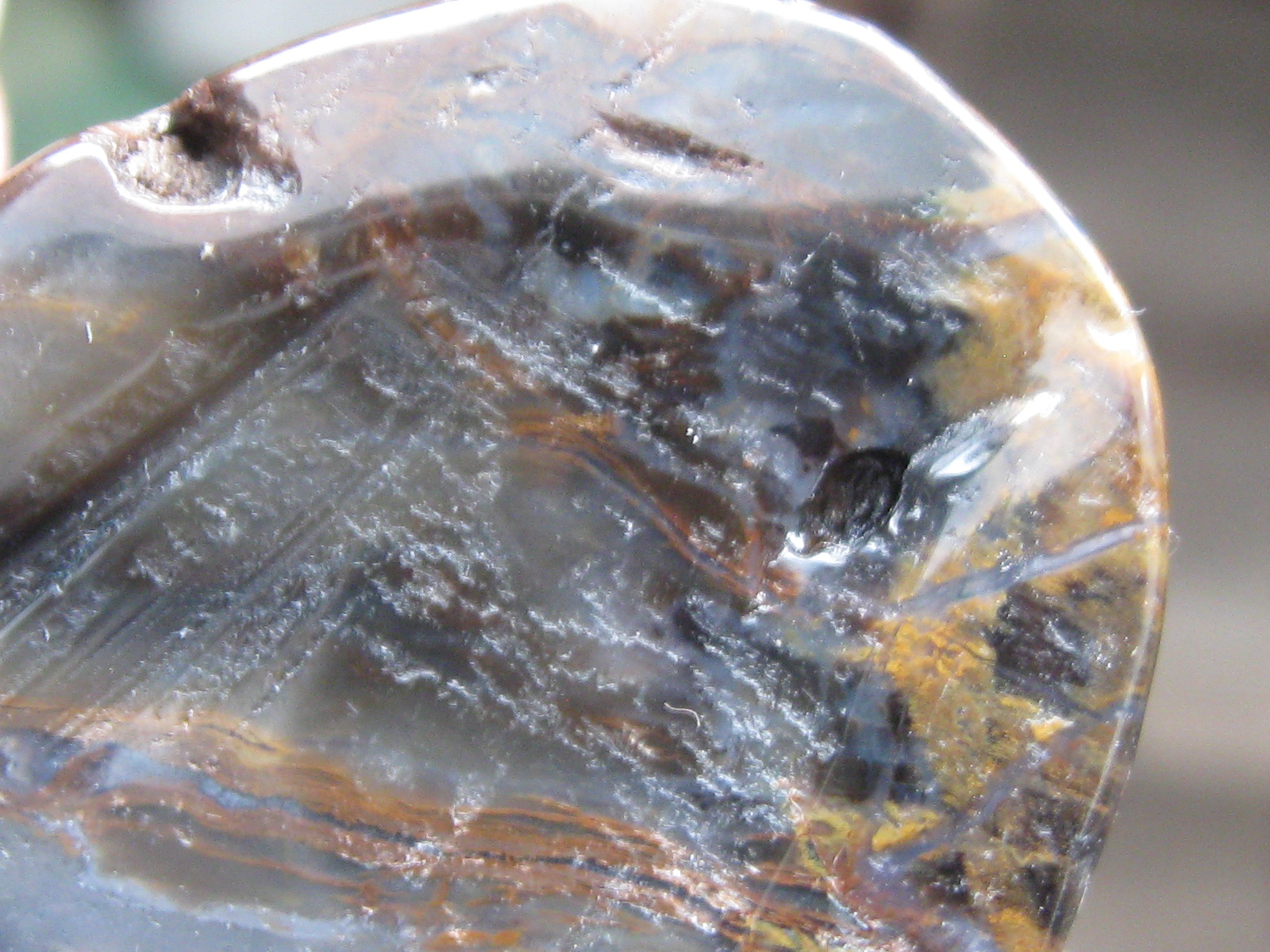 Ja. Ich denke, das ist grauer Chalcedon mit Tigeraugenschichten und etwas Jaspisanteilen. Er hat sogar einen schichtigen Aufbau, daher könnte man auch von Achat sprechen. Also von allem ein wenig, ein wahres Sammelsurium mikrokristalliner Quarze