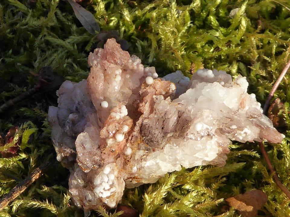 Pseudomorphosen von glänzenden Quarz-Kristallen nach Calcit-Rhomboedern, auf denen kleine, weiße Aragonit-Kugeln sitzen